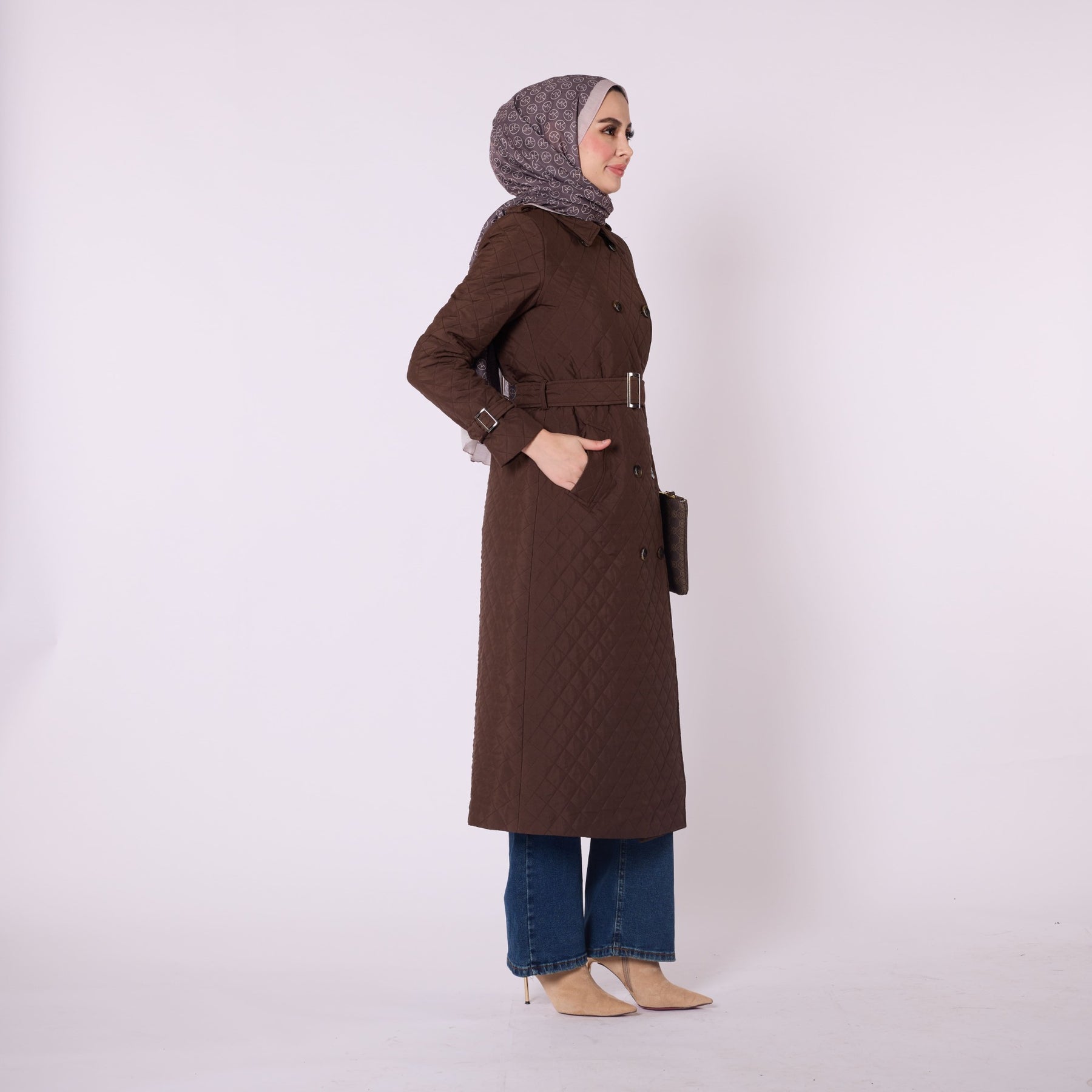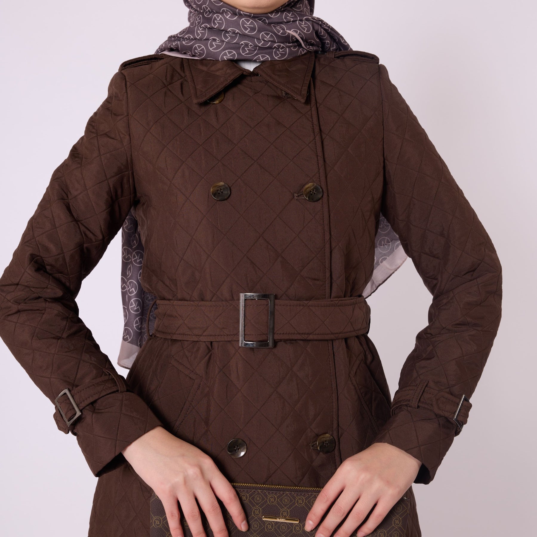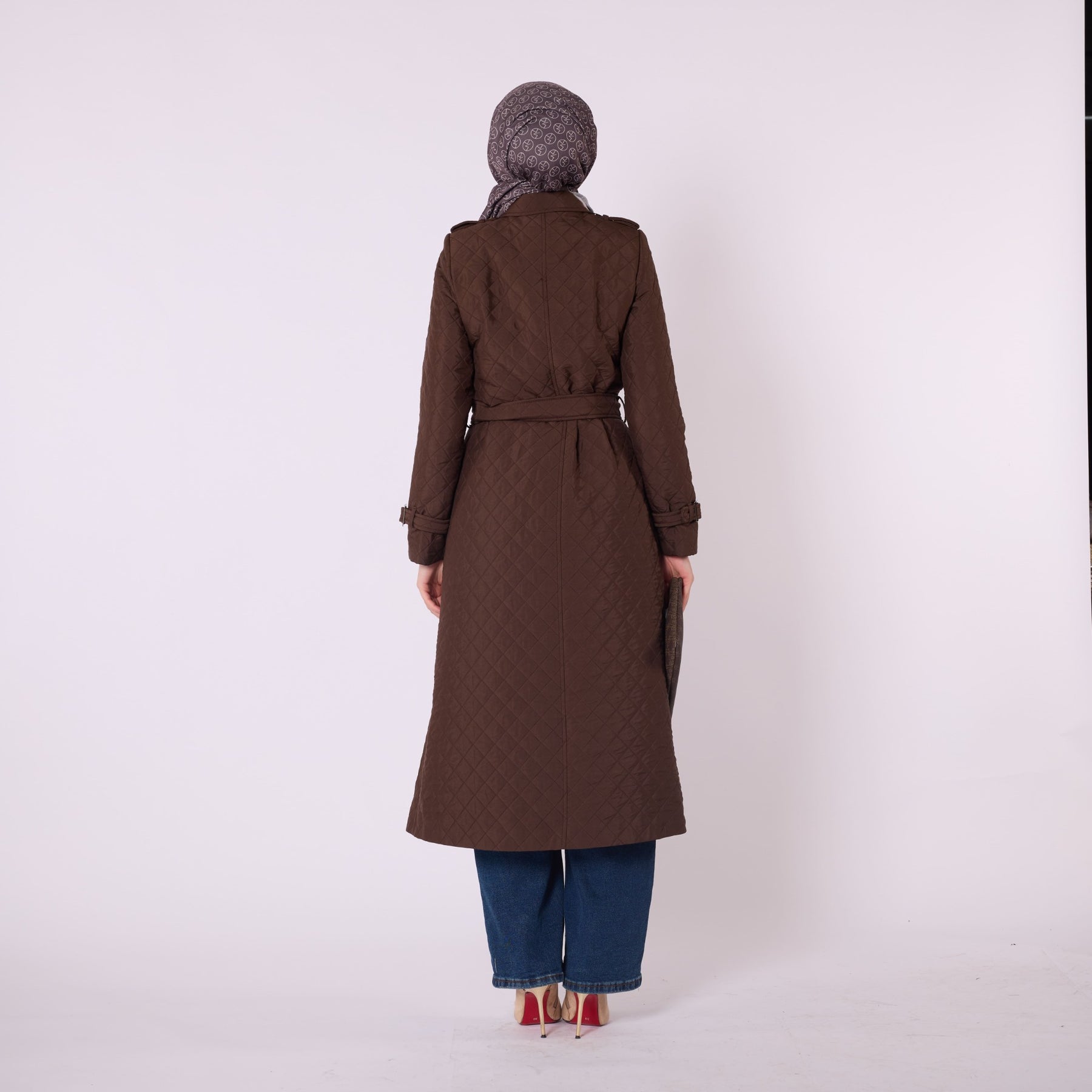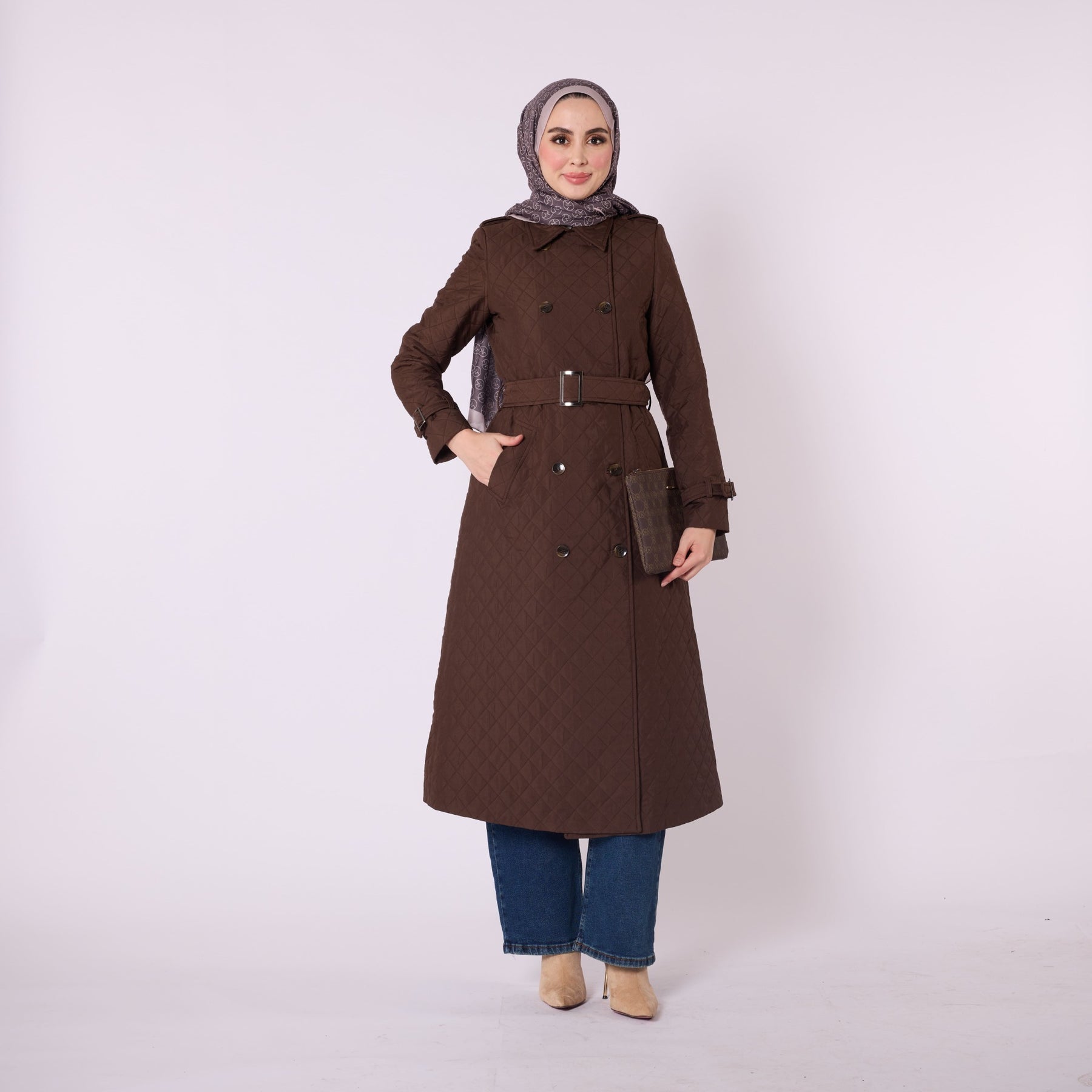 This quilted double-breasted coat combines warmth, durability and modern elegance, making it a standout winter essential. Crafted from 100% polyester, it provides reliable insulation against cold weather while maintaining a lightweight wear. The metallic-buckled belt enhances the waistline for a refined silhouette, and the polo collar adds a timeless touch. Its 120 cm length and full lining offer added comfort throughout the season. Featuring two practical front pockets, the coat pairs effortlessly with both casual and sophisticated winter outfits. Available in cream, brown, black and stone tones.