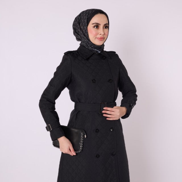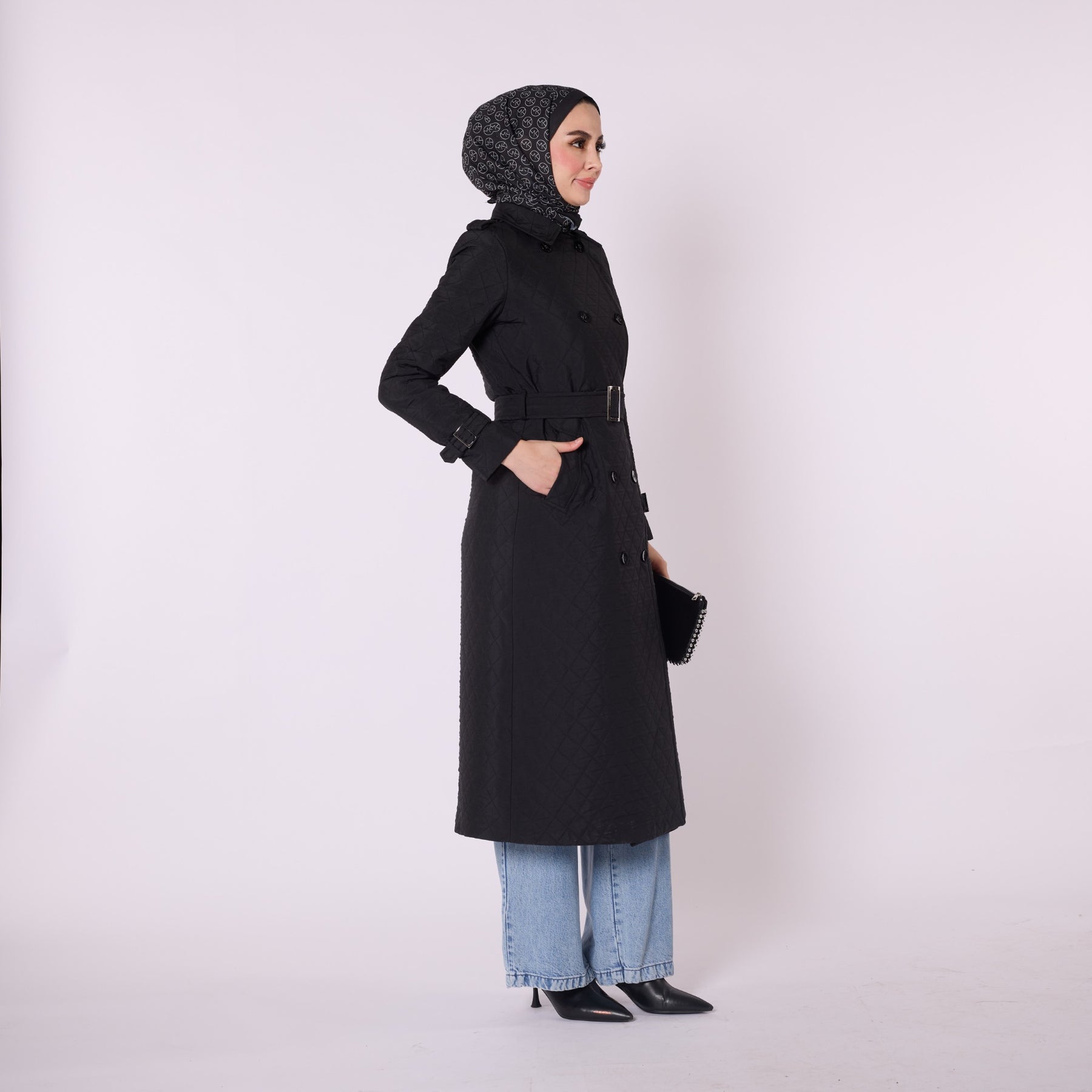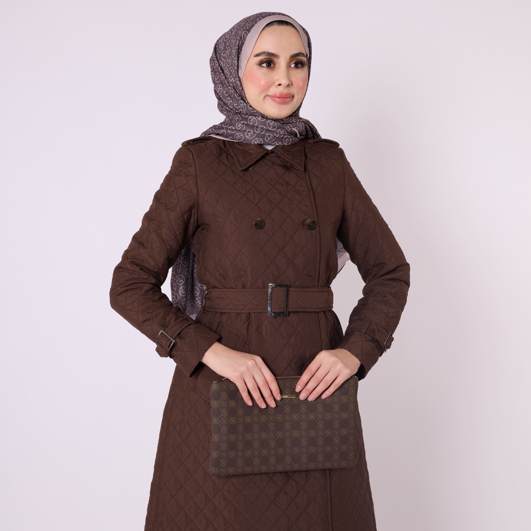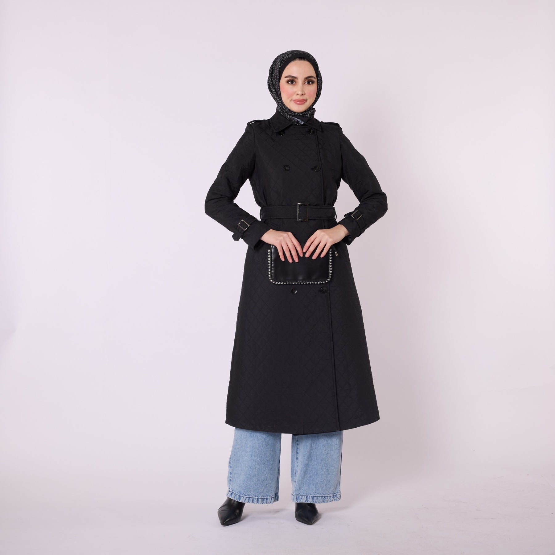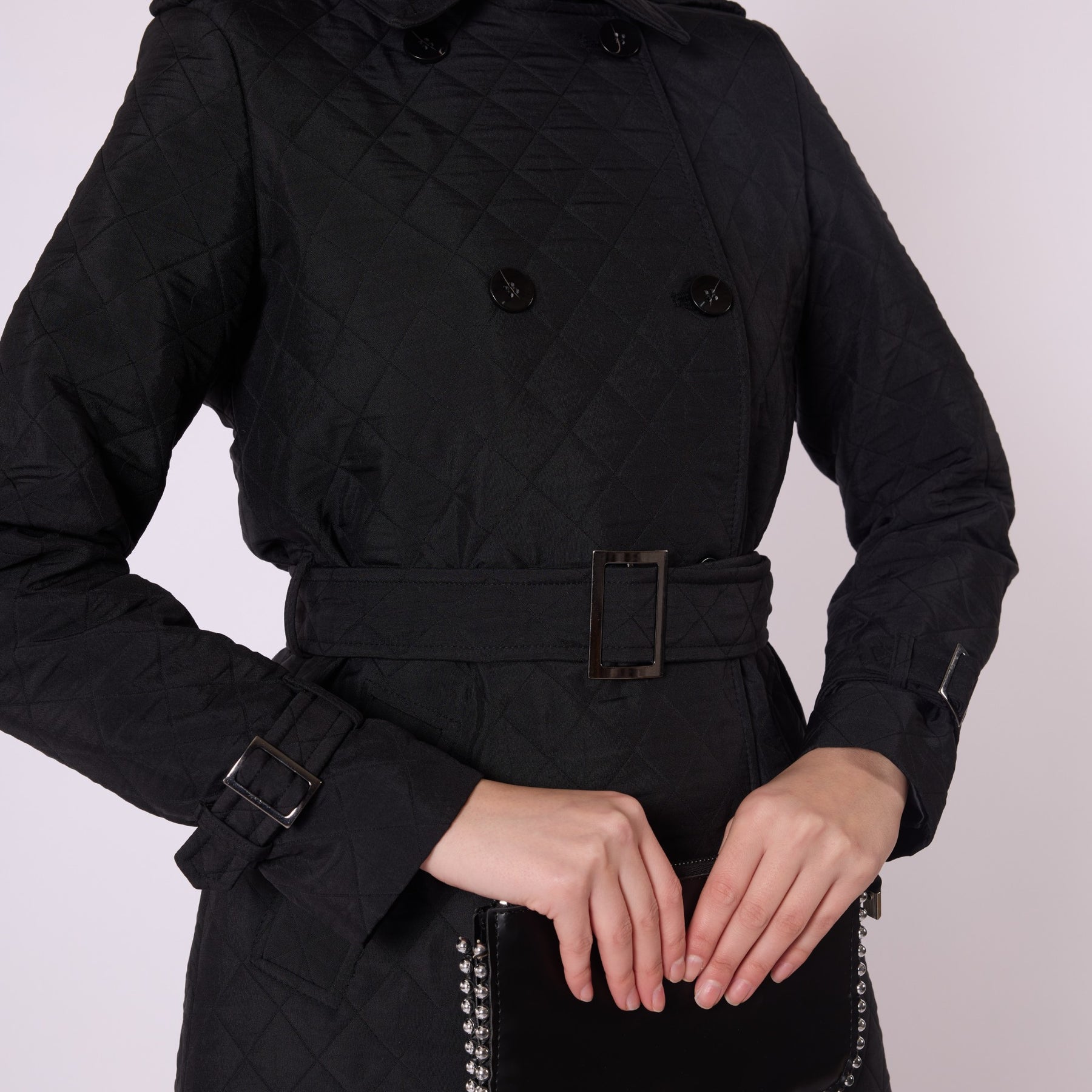 This quilted double-breasted coat combines warmth, durability and modern elegance, making it a standout winter essential. Crafted from 100% polyester, it provides reliable insulation against cold weather while maintaining a lightweight wear. The metallic-buckled belt enhances the waistline for a refined silhouette, and the polo collar adds a timeless touch. Its 120 cm length and full lining offer added comfort throughout the season. Featuring two practical front pockets, the coat pairs effortlessly with both casual and sophisticated winter outfits. Available in cream, brown, black and stone tones.