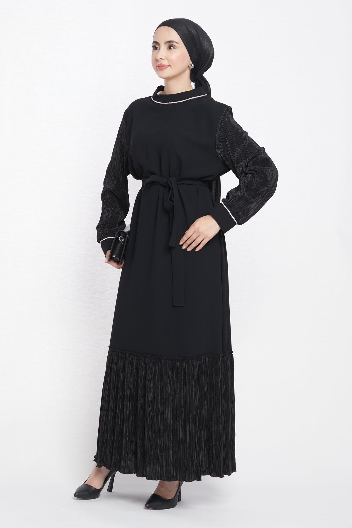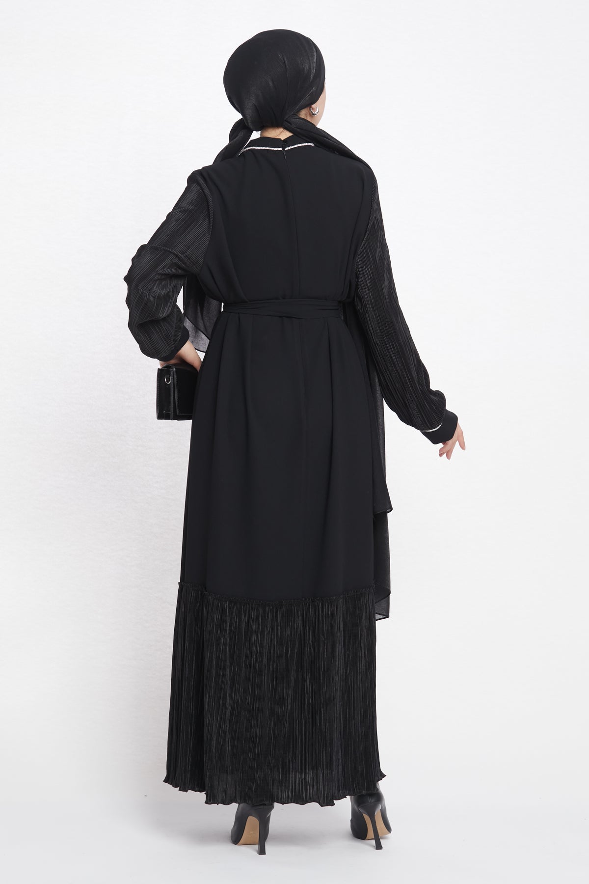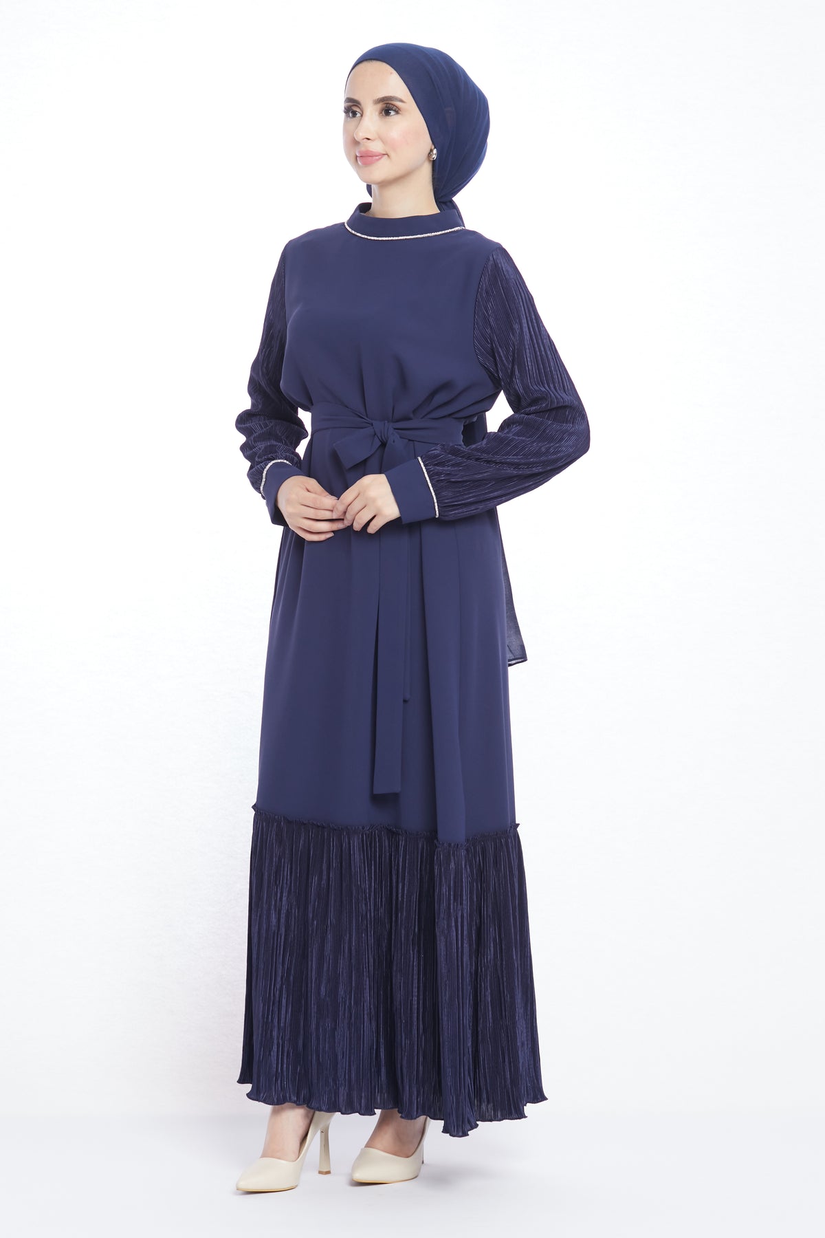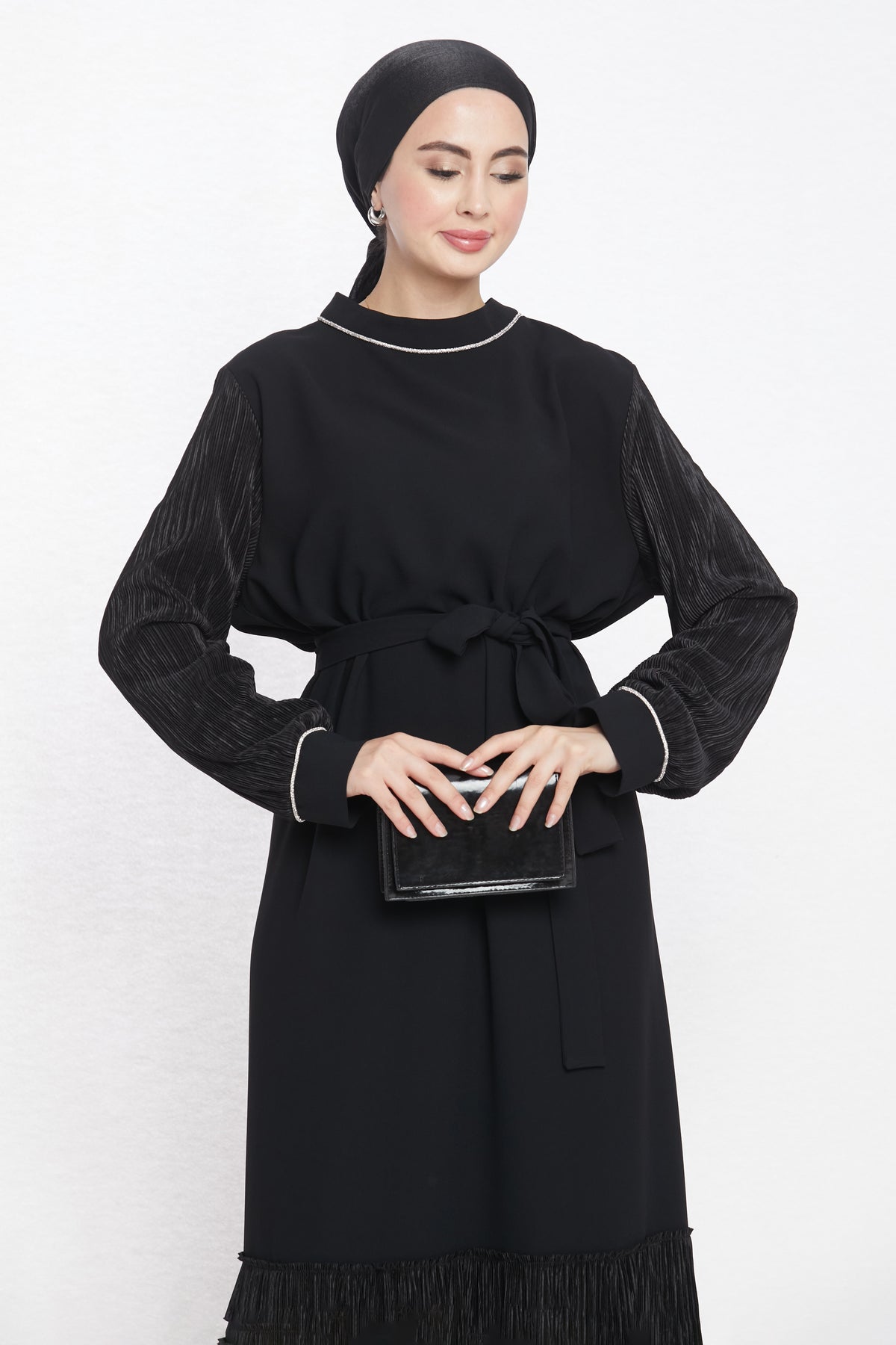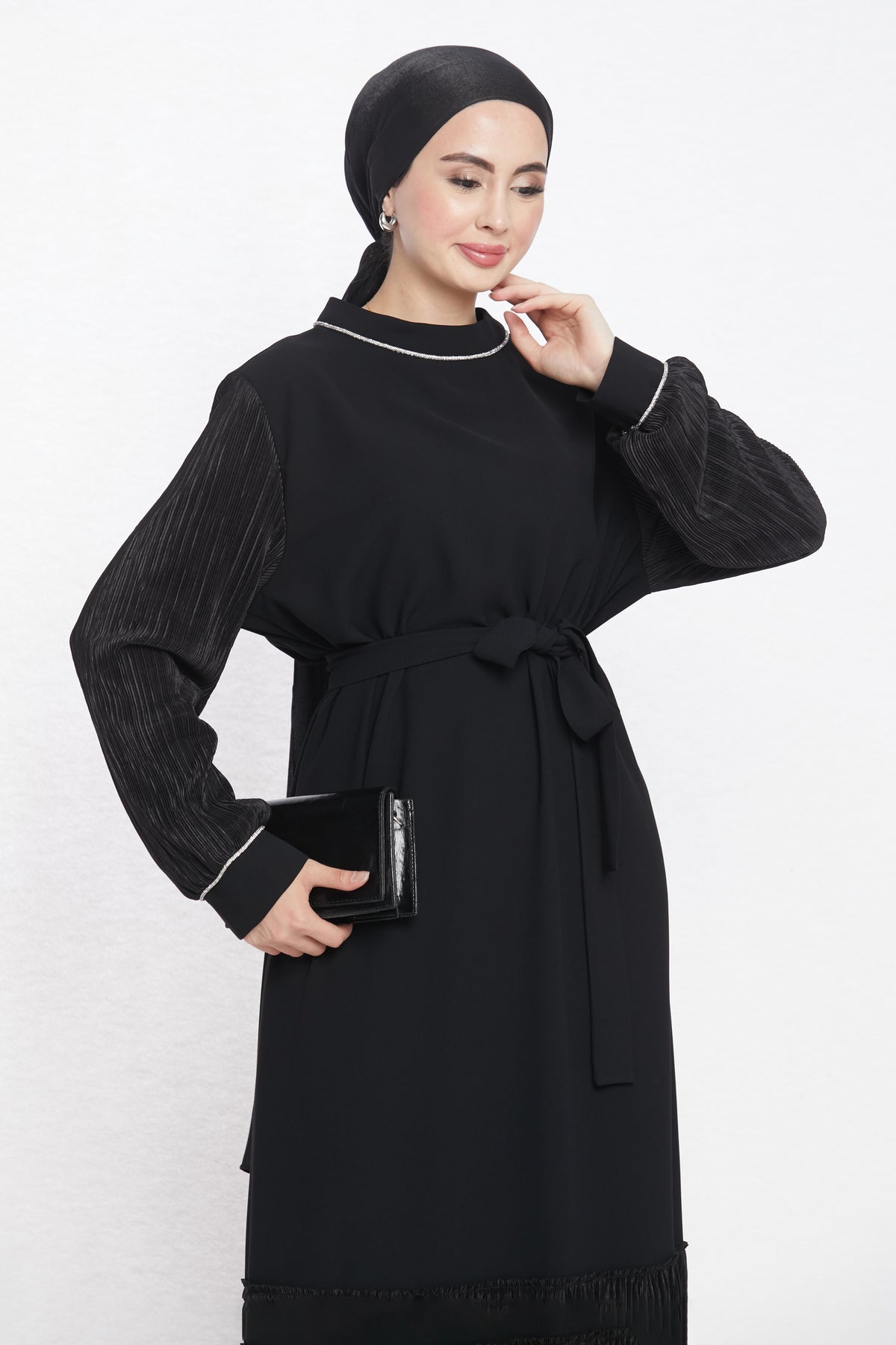 With its elegance and unique design, the special design dress with sleeve and hem details brings a sophisticated touch to your wardrobe. The ribbed contrasting fabric used on the sleeves and hem adds a refined texture to the design. Sparkling stone details around the neckline and sleeve openings enhance its modern appeal. The matching belt accentuates the waist gracefully, making this dress a striking choice for both special events and stylish gatherings.