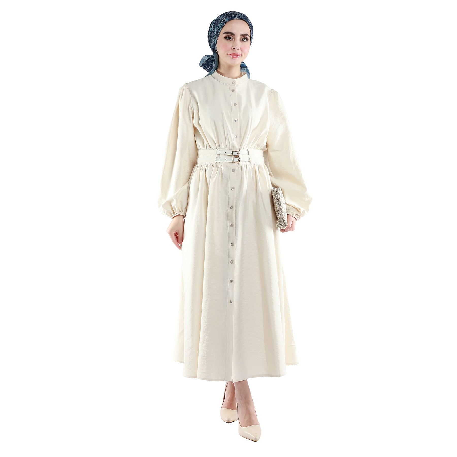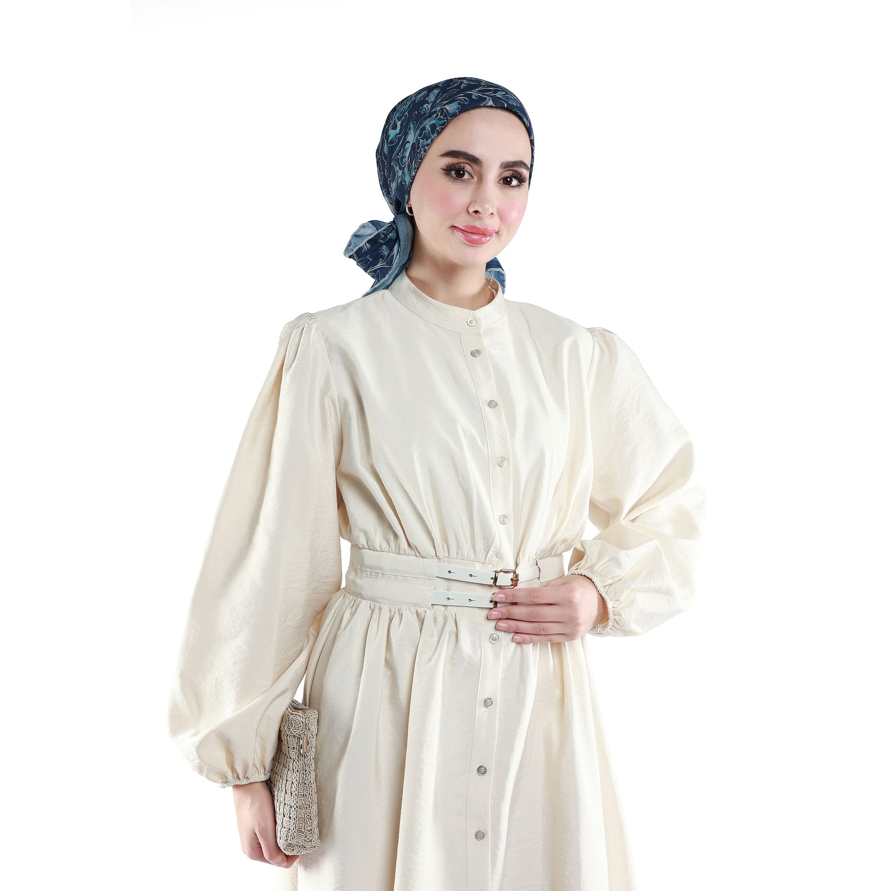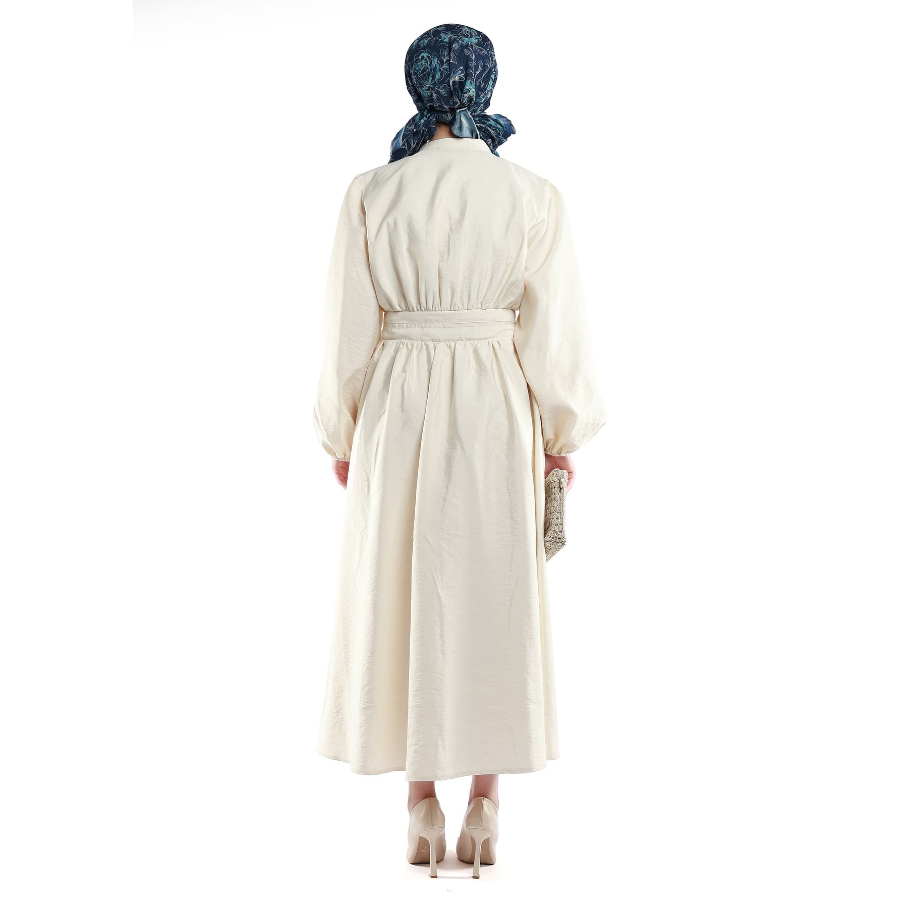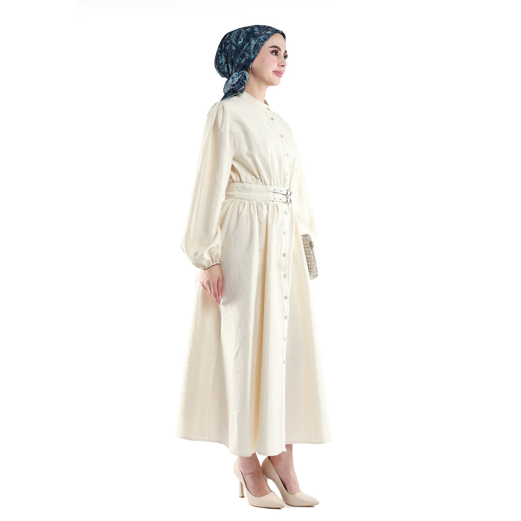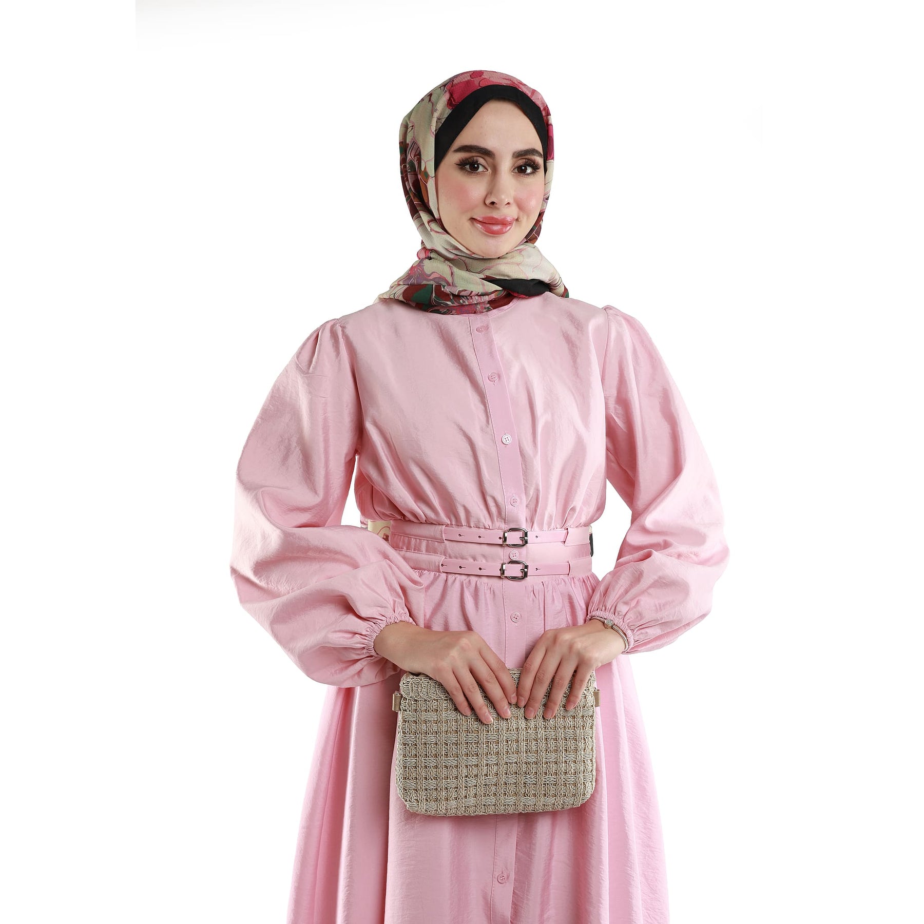 This round-neck dress with double belt details features a lightweight, summer-appropriate design. The double belts at the waist add a stylish touch, while the buttoned front and gathered sleeves enhance its elegance and comfort. Ideal for daily wear.