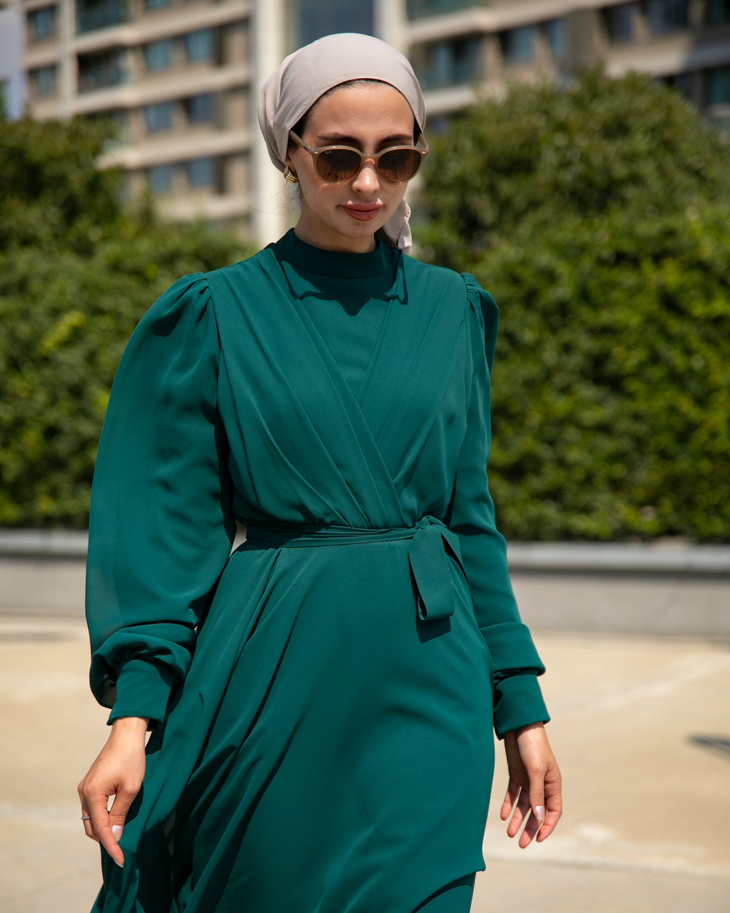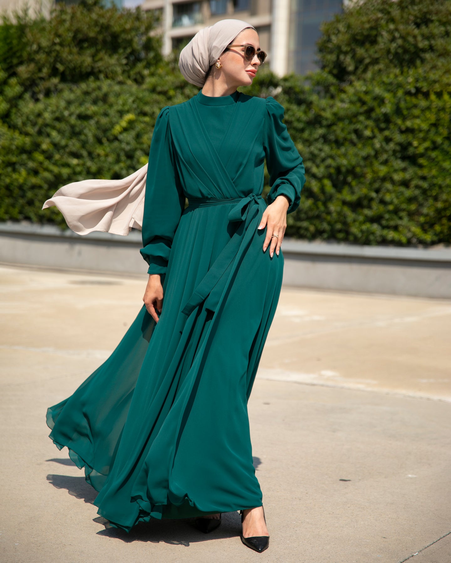 The long-sleeve chiffon dress offers an elegant and feminine style. Its lined design ensures comfort, while the lightweight chiffon fabric adds a delicate and romantic touch. The waist belt detail enhances the silhouette with a refined look.