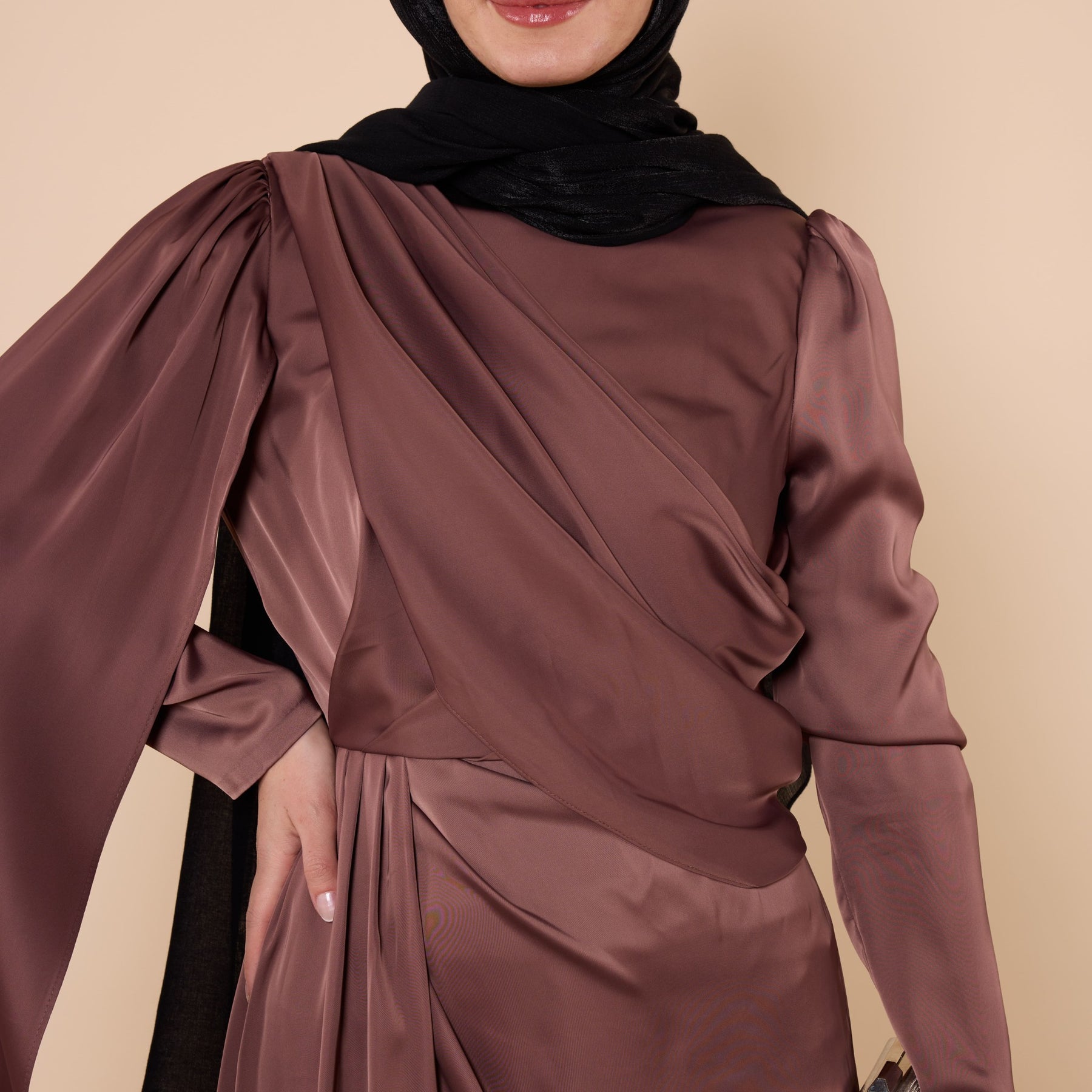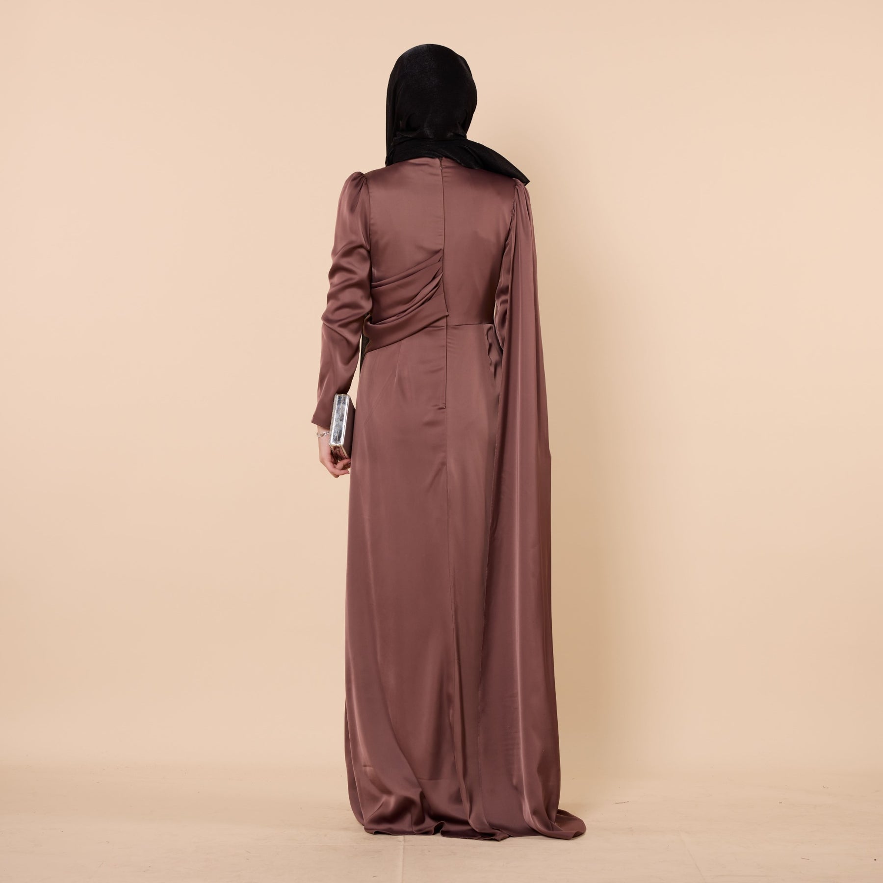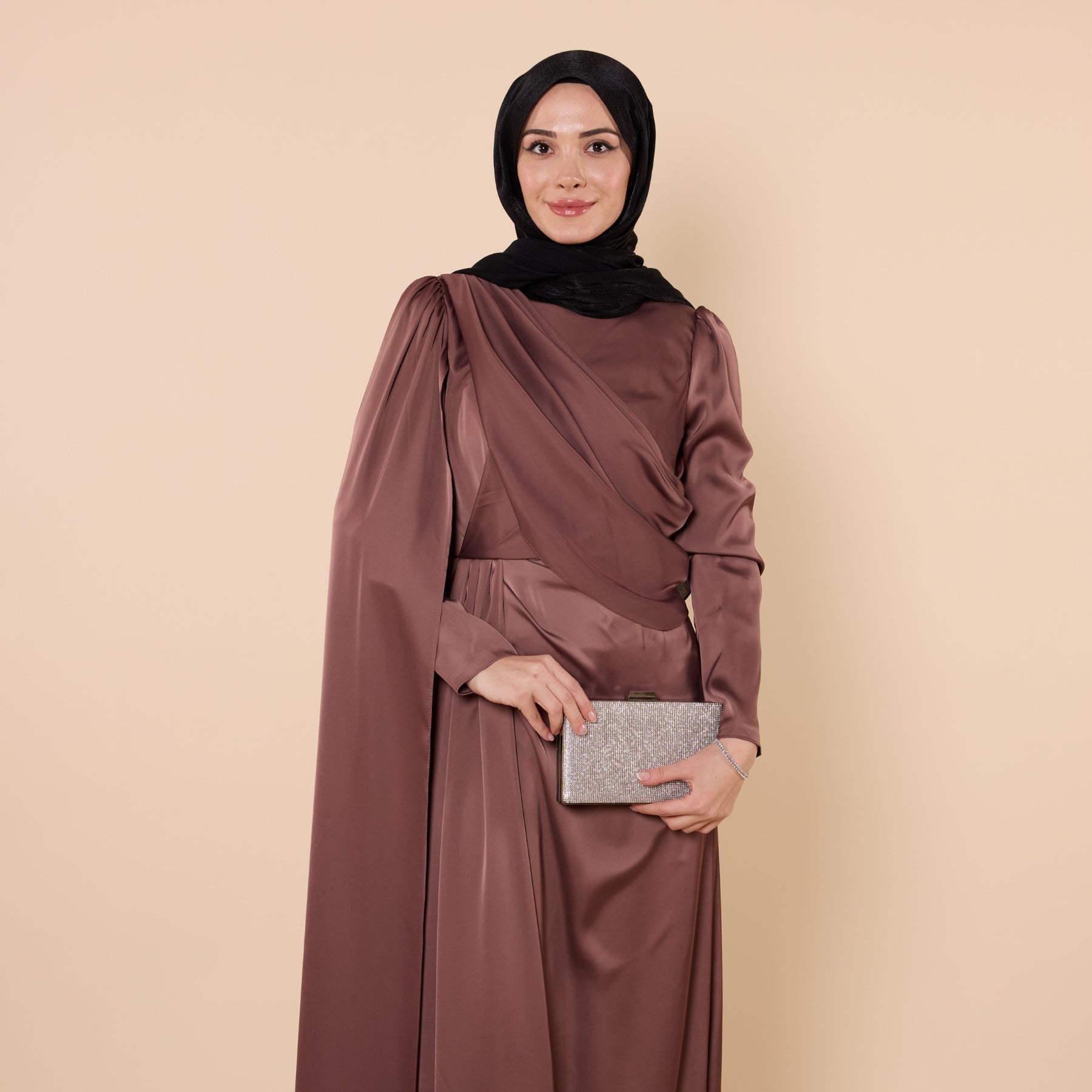 Featuring elegant cape sleeves and a cross belt design, this evening dress delivers a refined and striking look for special occasions. Its fluid silhouette drapes smoothly over the body, while the fully lined construction ensures comfortable and confident wear. The cape-style sleeves add movement and volume, creating a modern profile, and the cross belt detail defines the waist for a balanced, flattering fit.