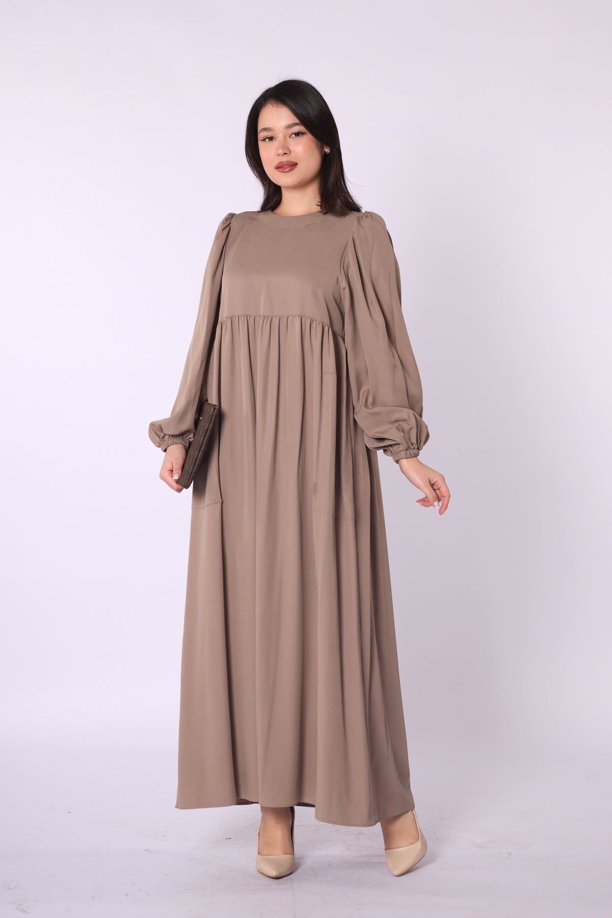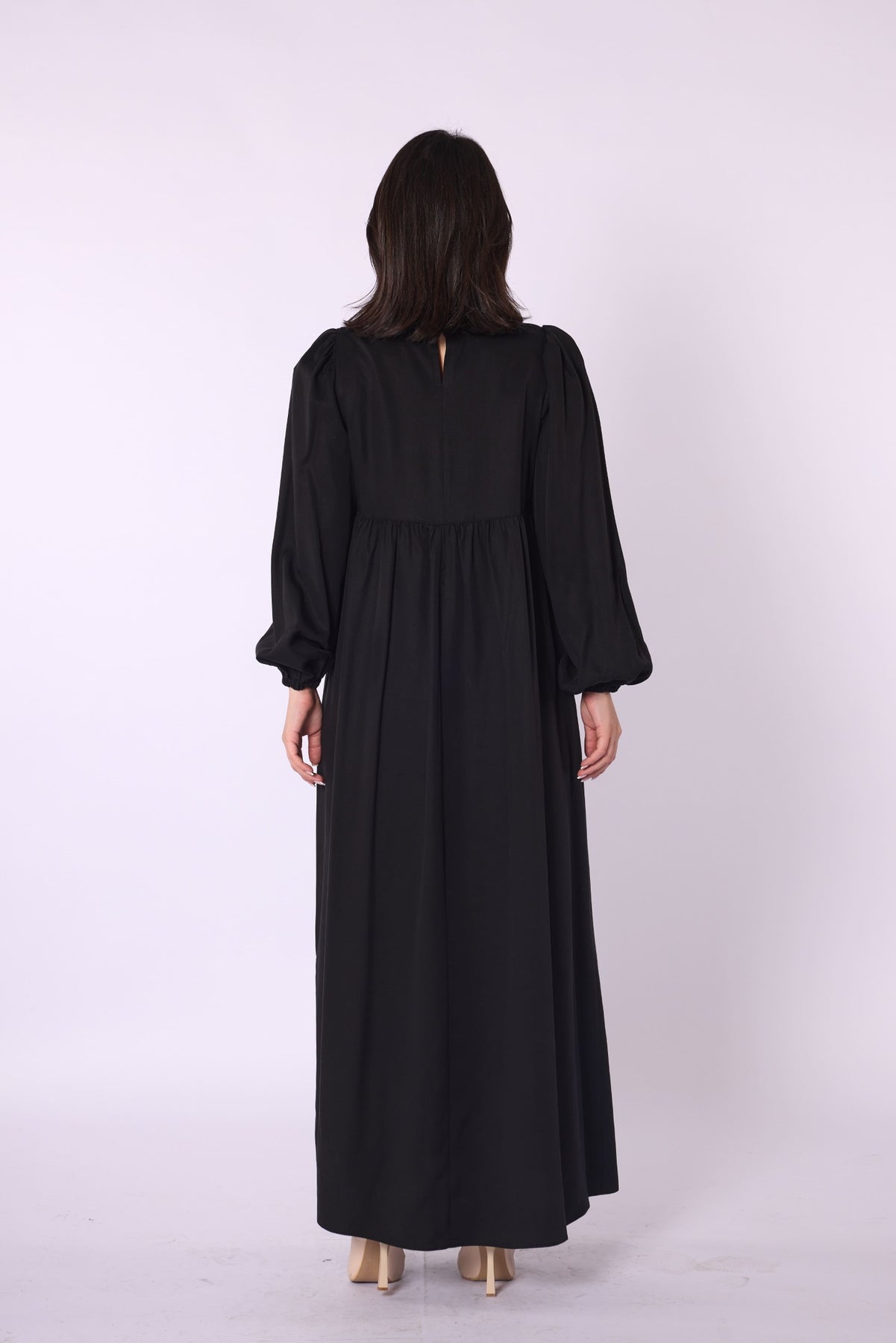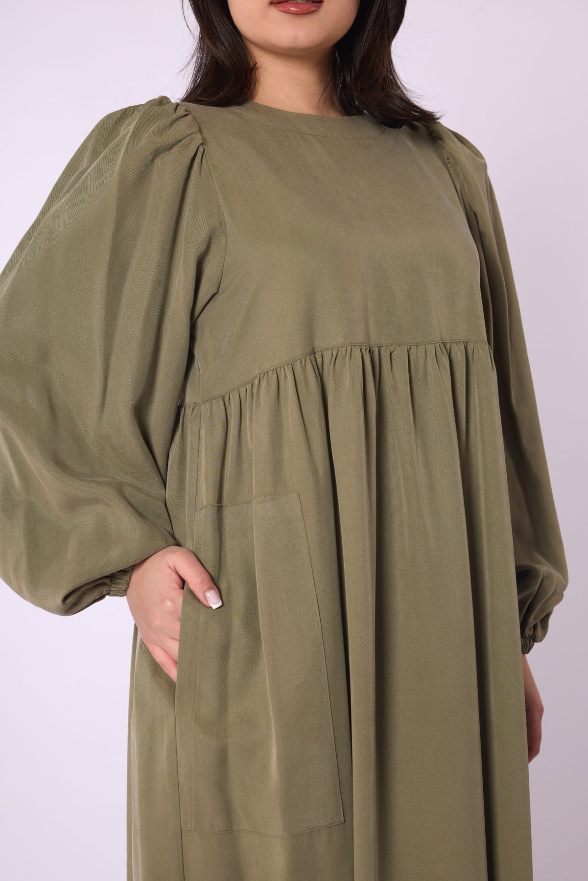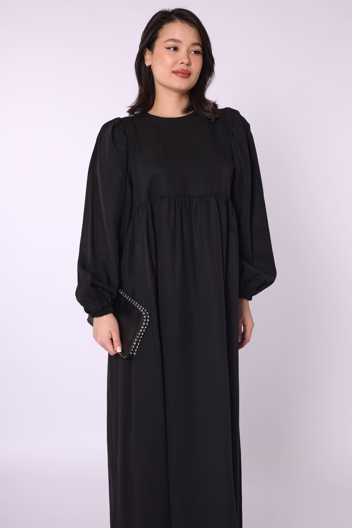 Designed for effortless everyday elegance, the Ruched Pocket Long Dress offers a comfortable, fluid silhouette that’s easy to wear all day. The ruched detail at the upper part adds movement and a refined touch, while the tie-style finish creates a subtle statement. Elasticated sleeves enhance comfort and practicality, and the functional pockets make it ideal for daily wear.