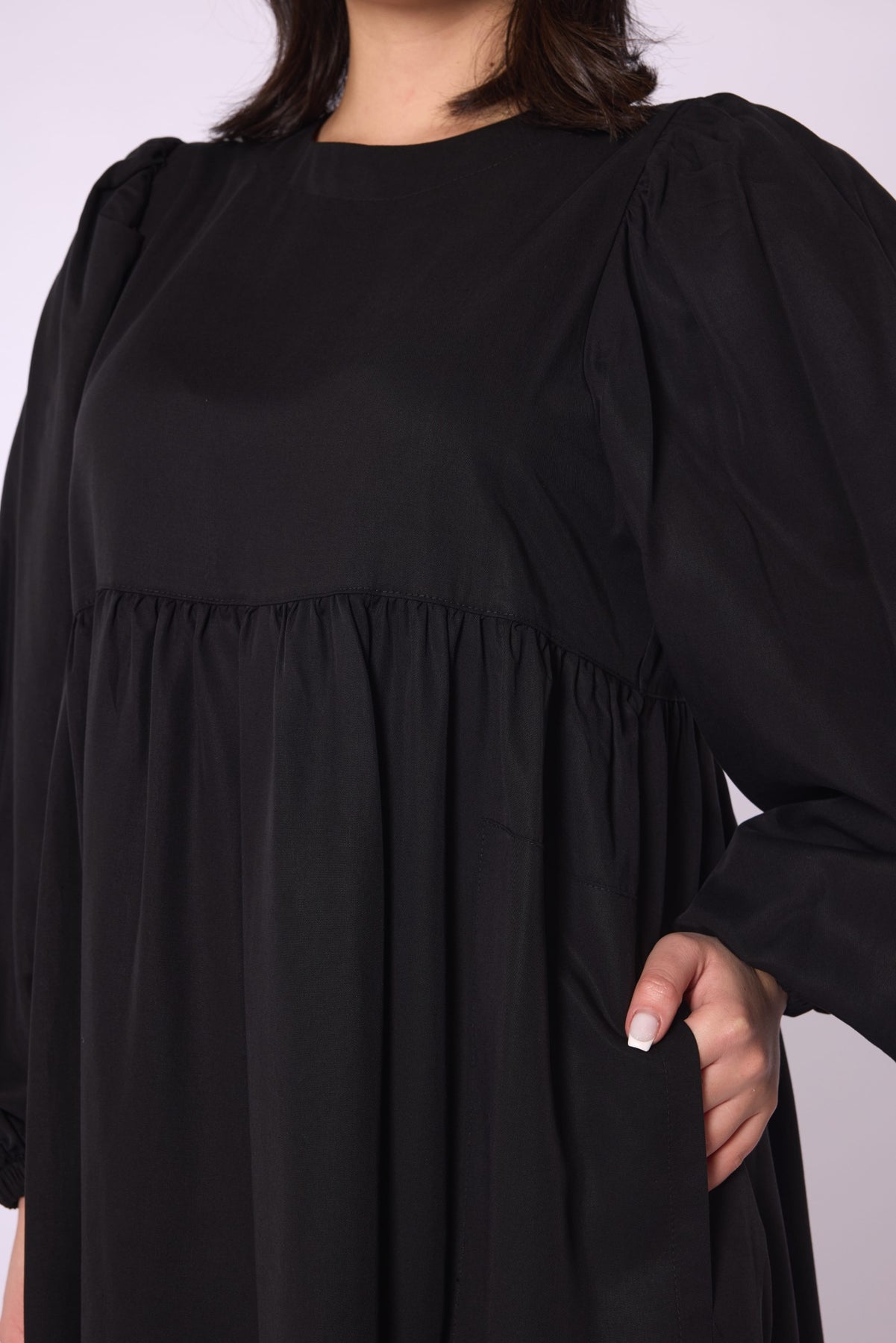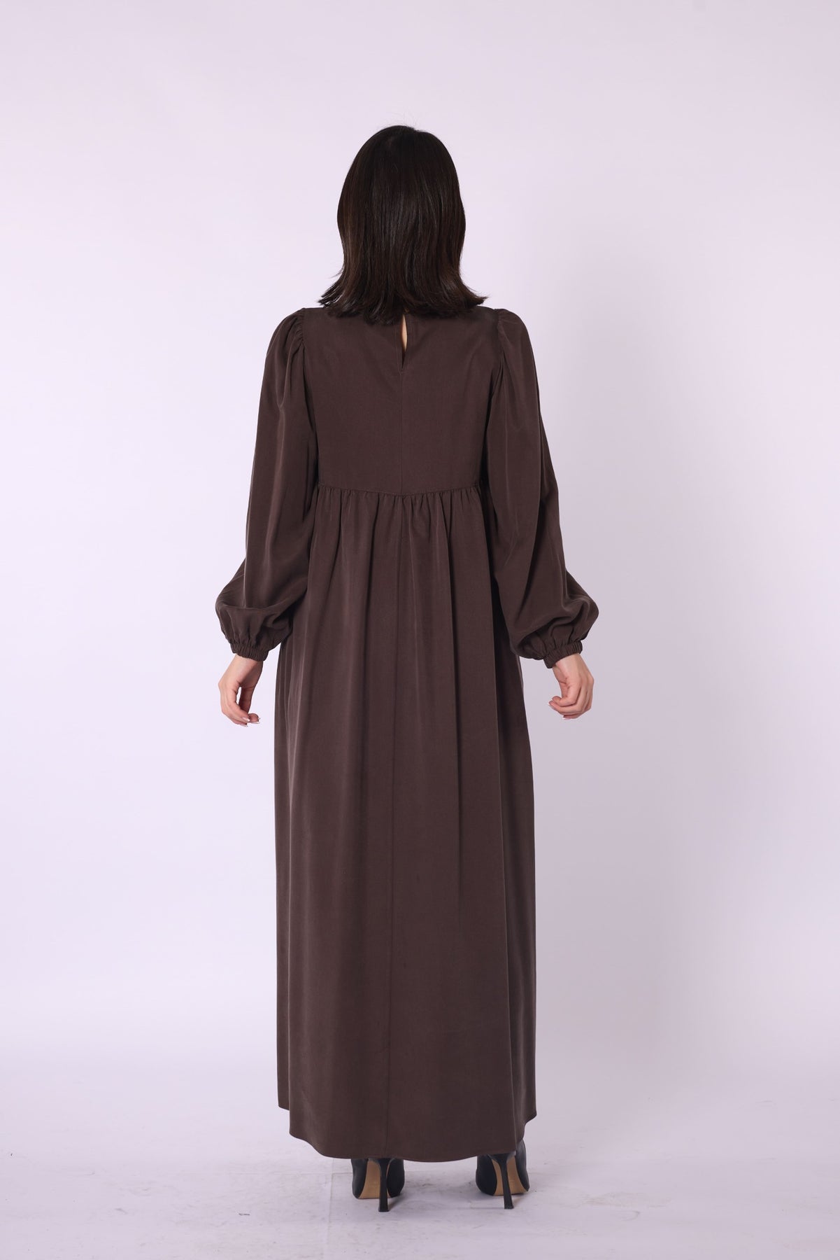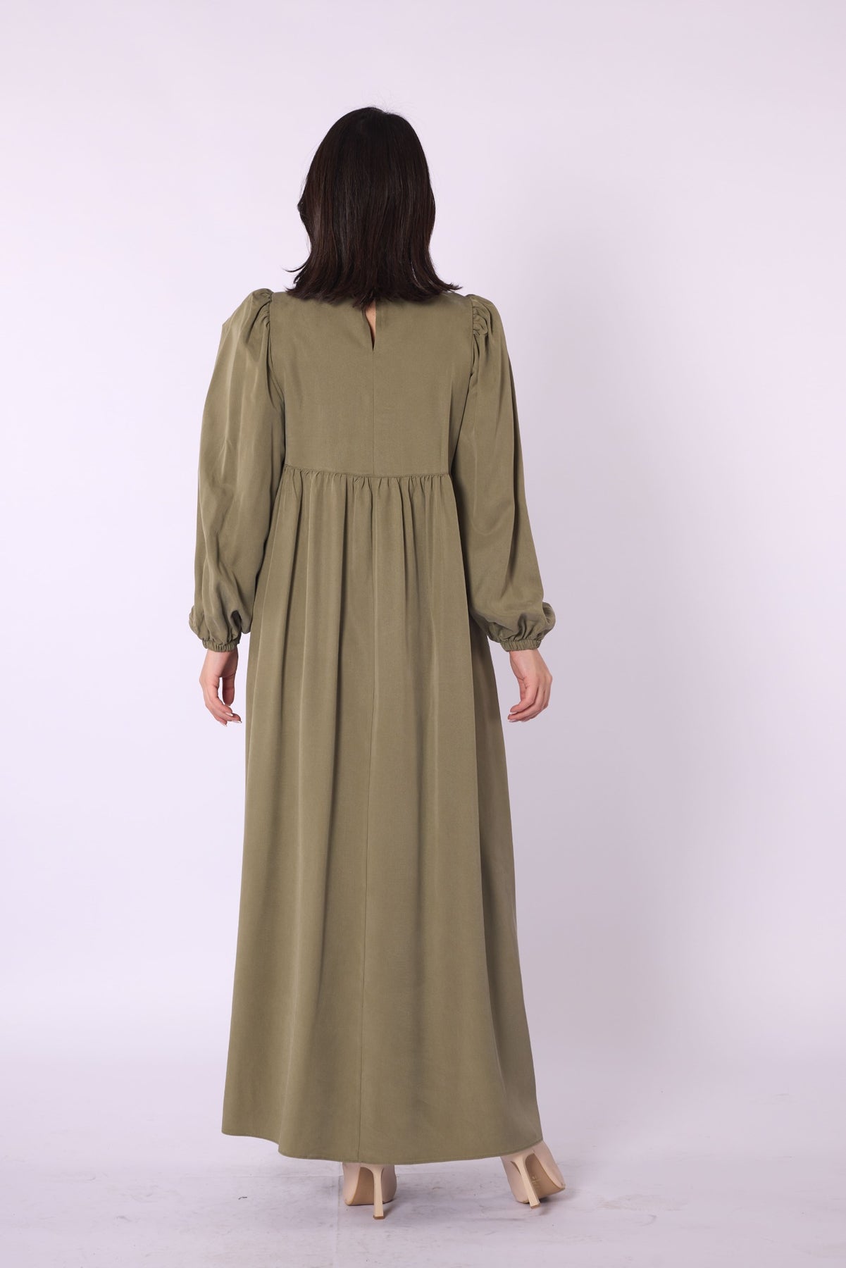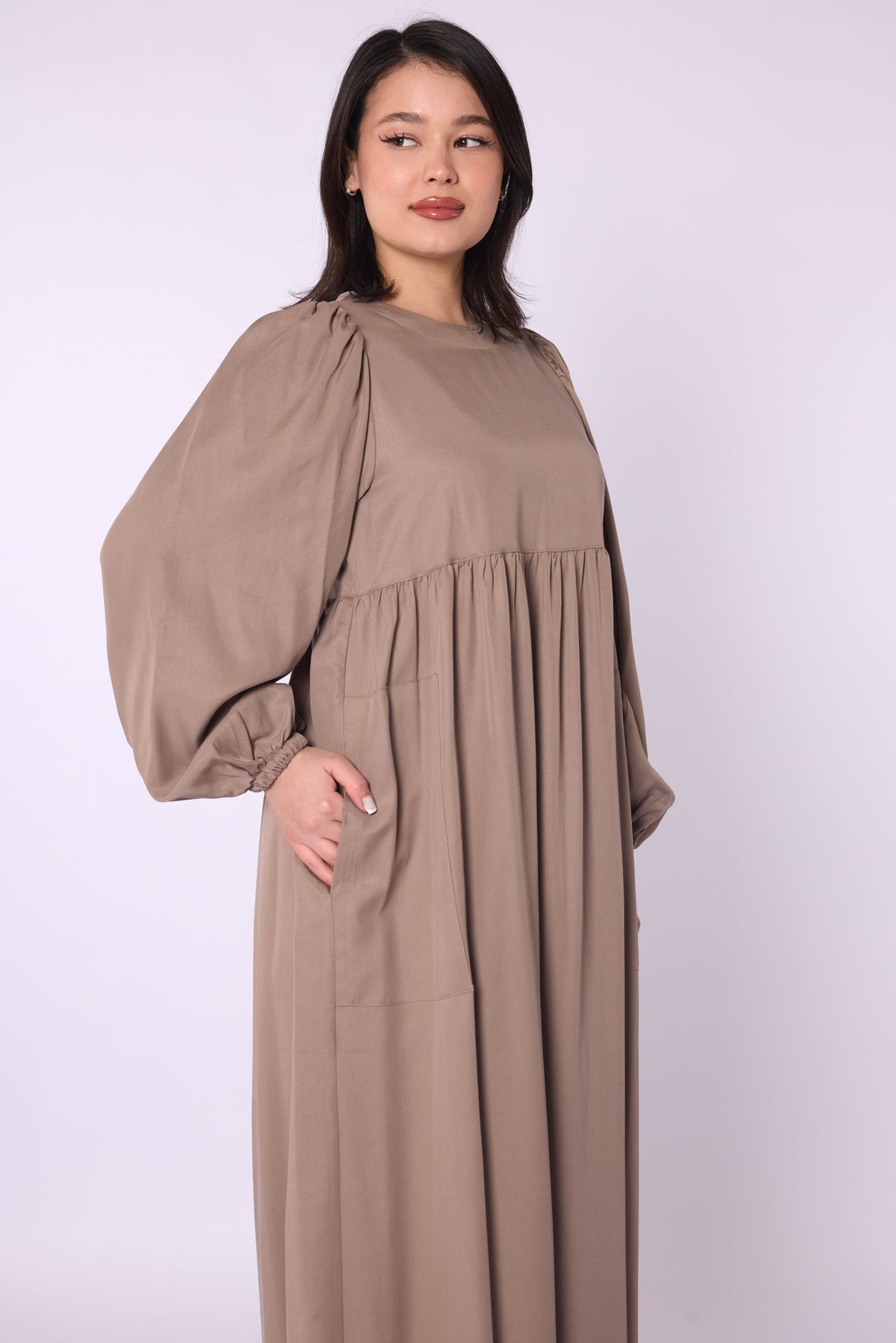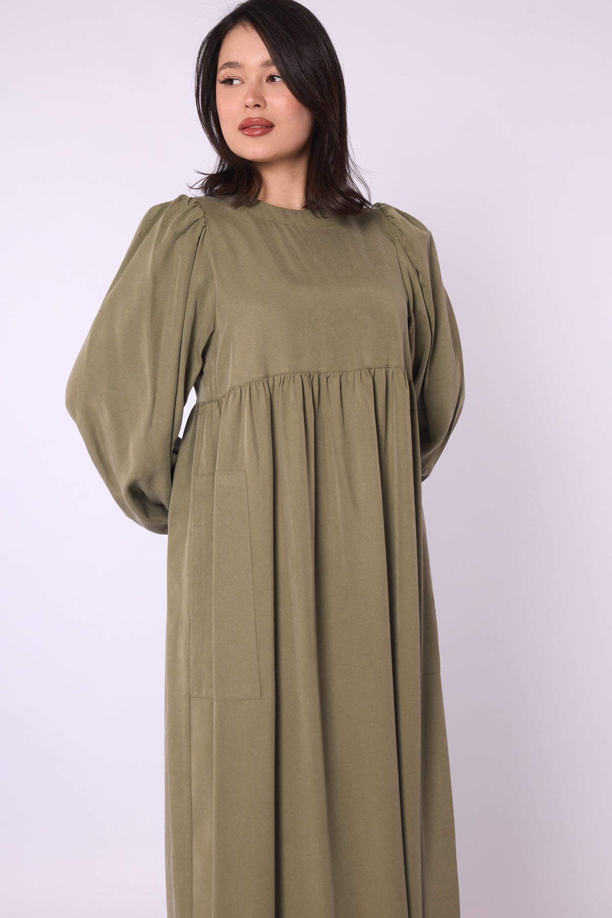 Designed for effortless everyday elegance, the Ruched Pocket Long Dress offers a comfortable, fluid silhouette that’s easy to wear all day. The ruched detail at the upper part adds movement and a refined touch, while the tie-style finish creates a subtle statement. Elasticated sleeves enhance comfort and practicality, and the functional pockets make it ideal for daily wear.
