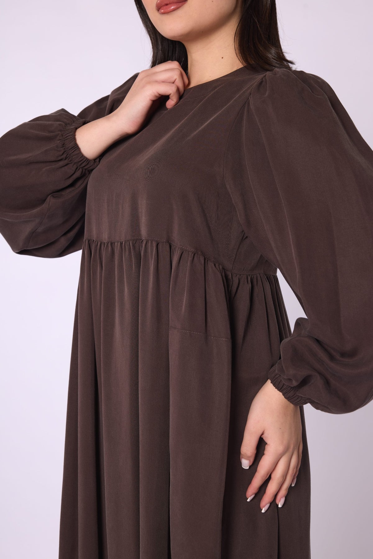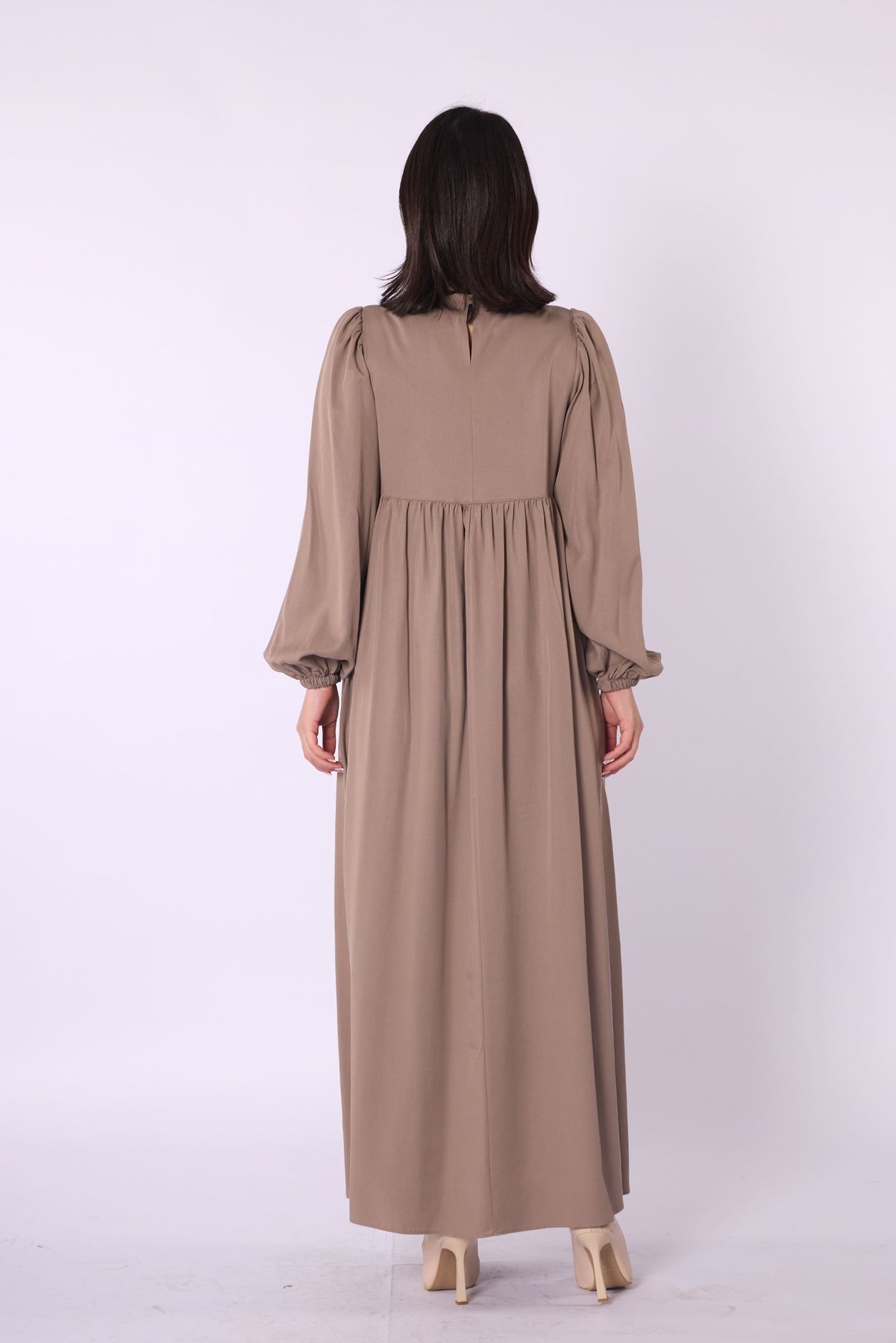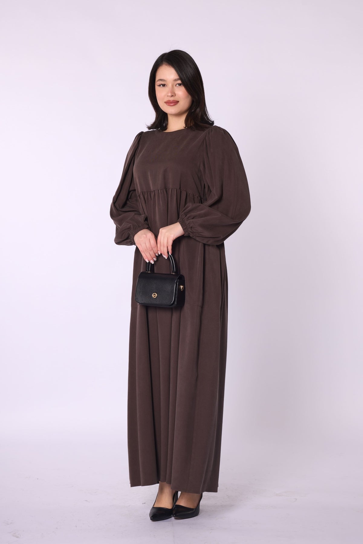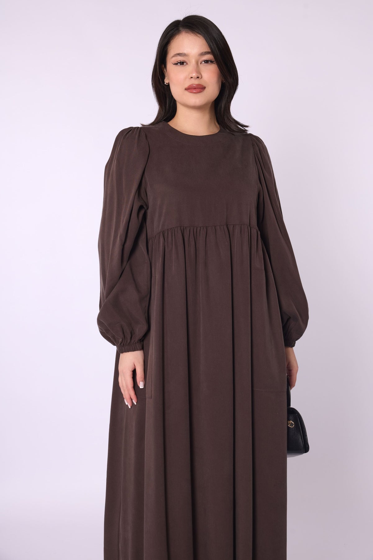 Designed for effortless everyday elegance, the Ruched Pocket Long Dress offers a comfortable, fluid silhouette that’s easy to wear all day. The ruched detail at the upper part adds movement and a refined touch, while the tie-style finish creates a subtle statement. Elasticated sleeves enhance comfort and practicality, and the functional pockets make it ideal for daily wear.