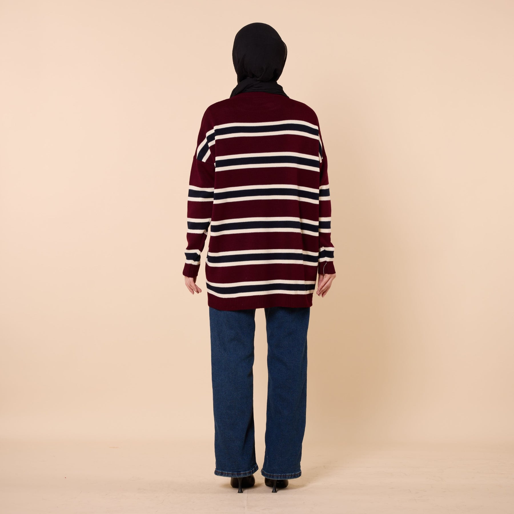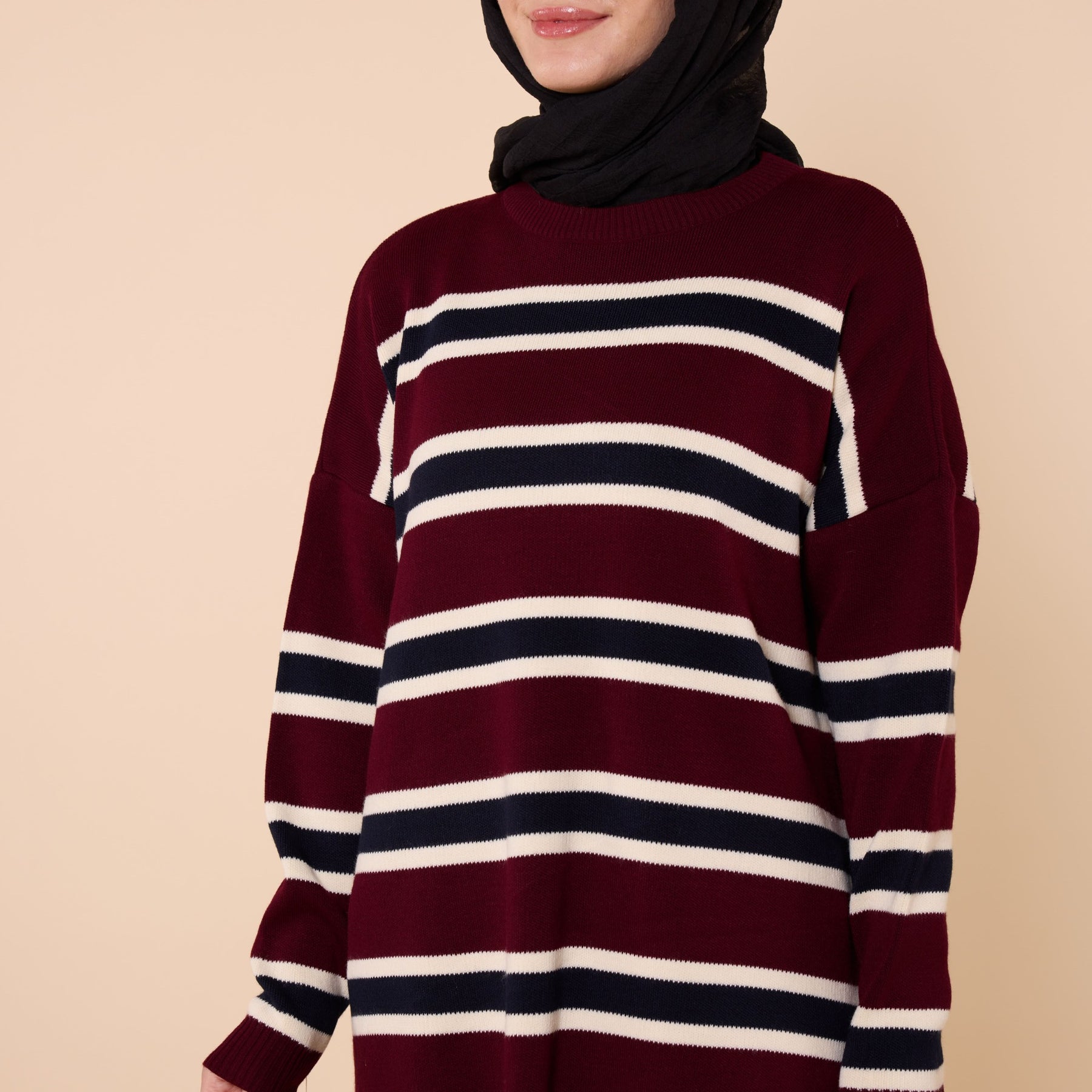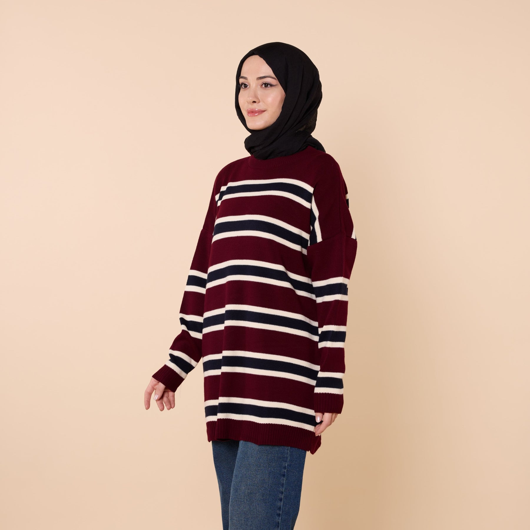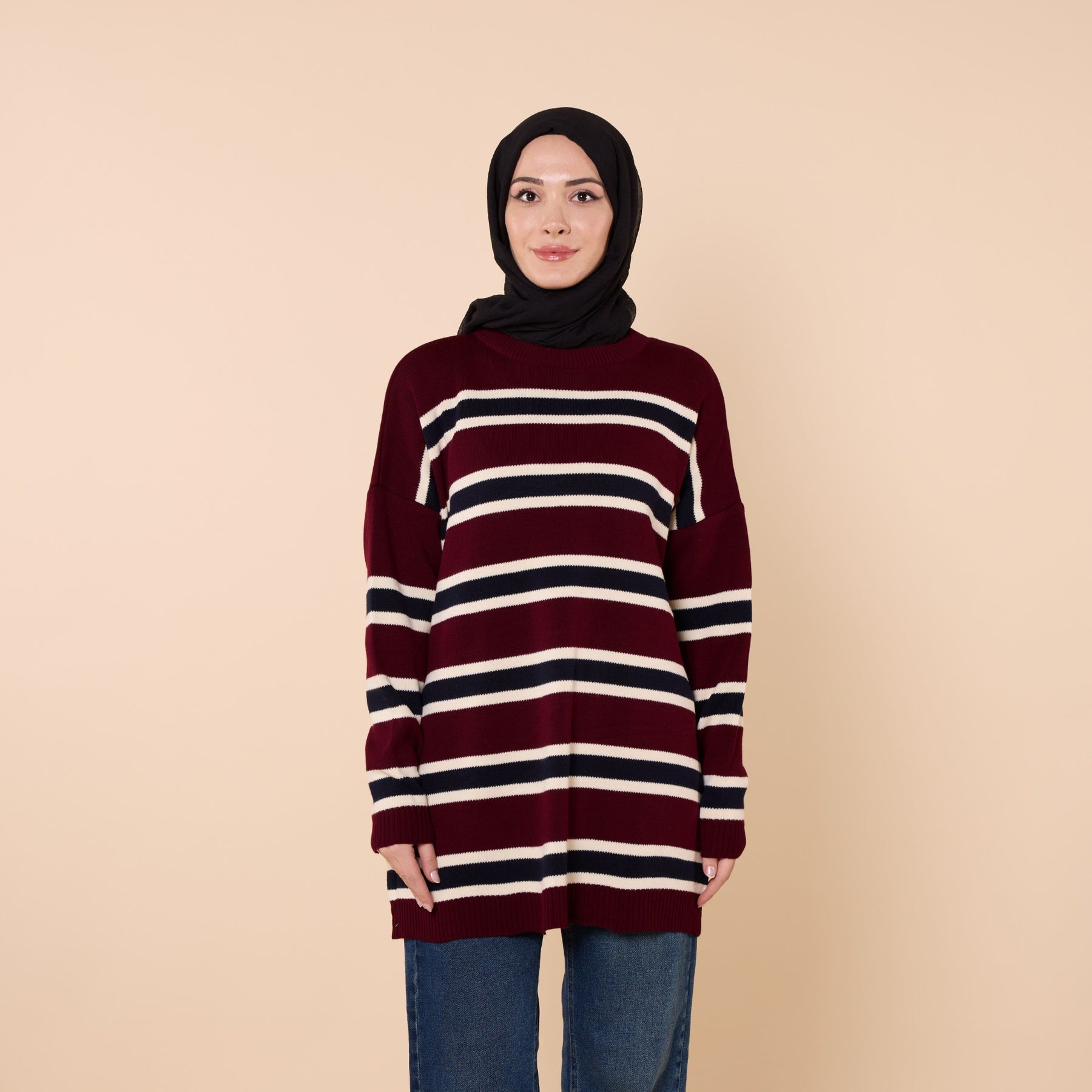 This long knit tunic stands out with its timeless striped pattern, offering a clean yet confident look ideal for everyday styling. The classic crew neckline provides a comfortable and modern feel, while the elongated silhouette drapes smoothly without clinging to the body. Its knit structure delivers warmth in cooler weather while maintaining all-day comfort.