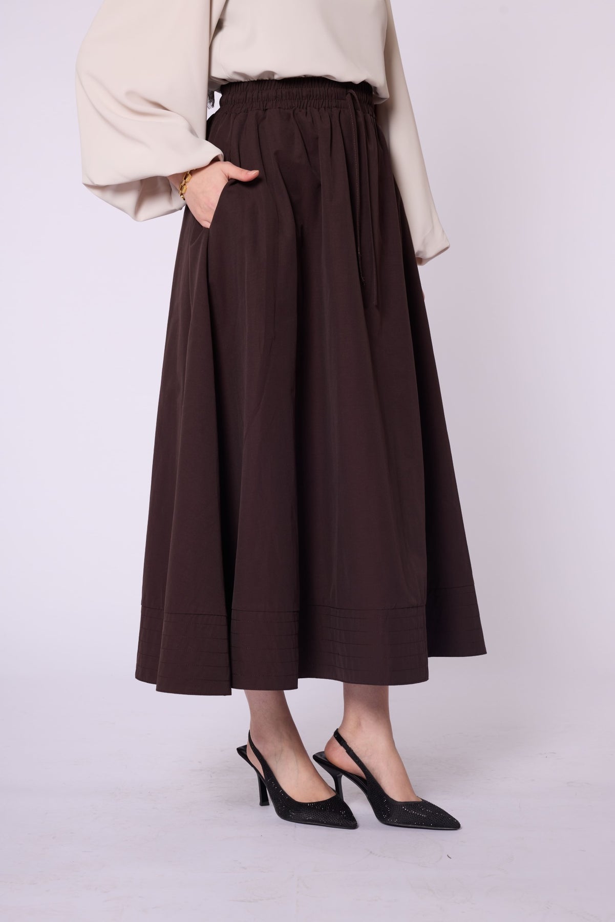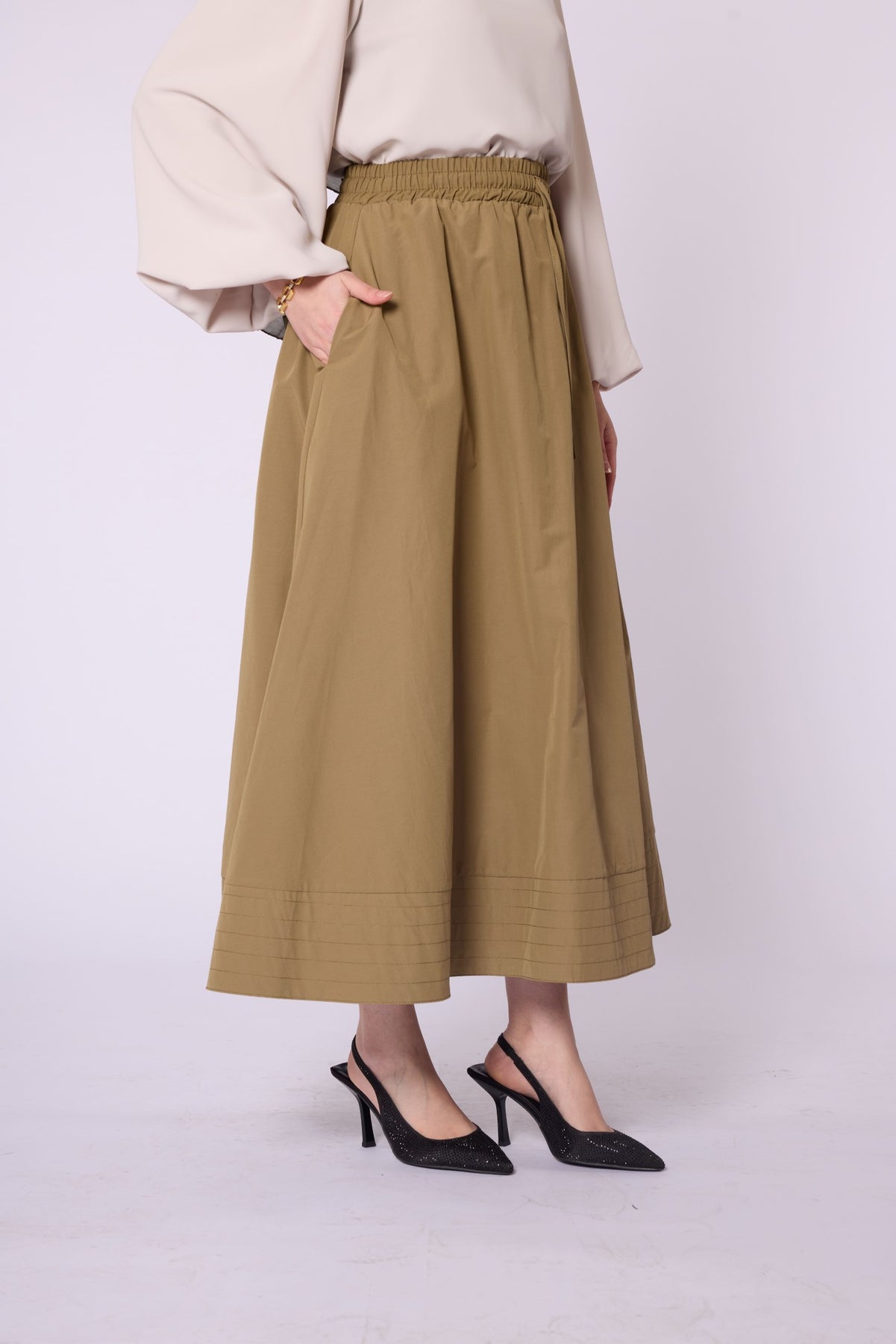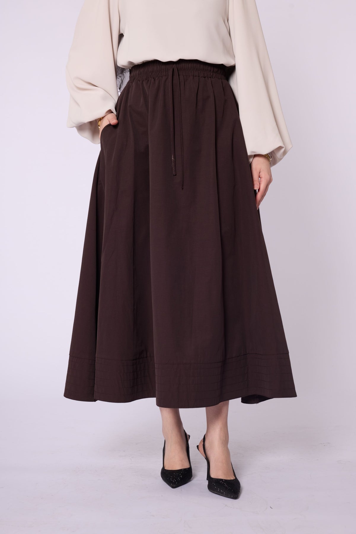 • Model: Stitch-detail flared skirt with elastic & drawstring waist