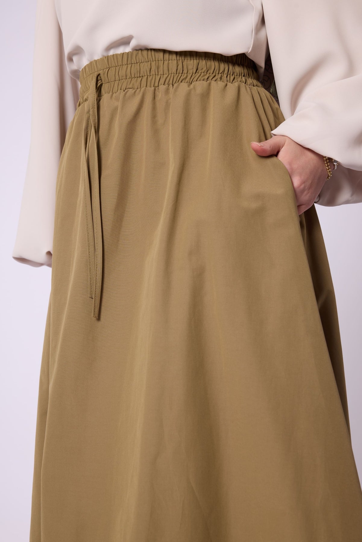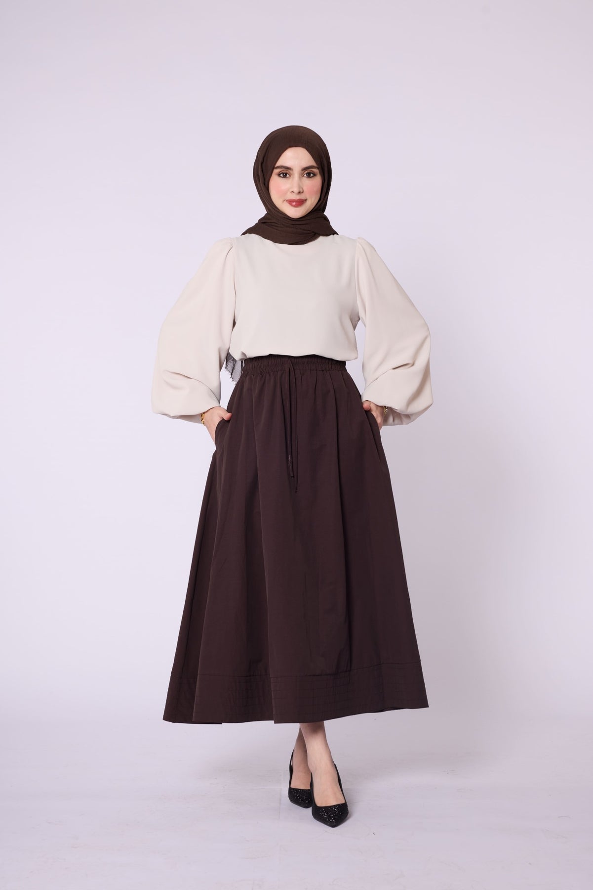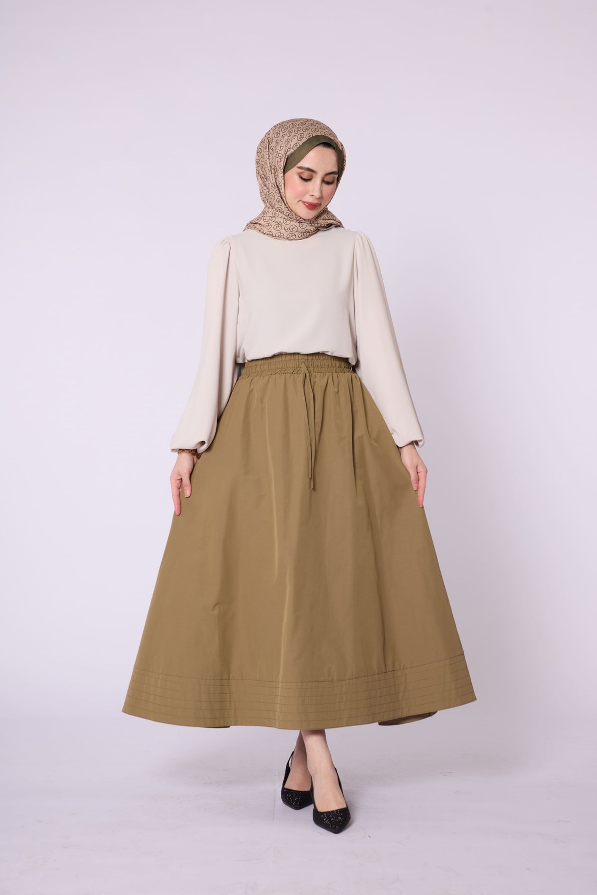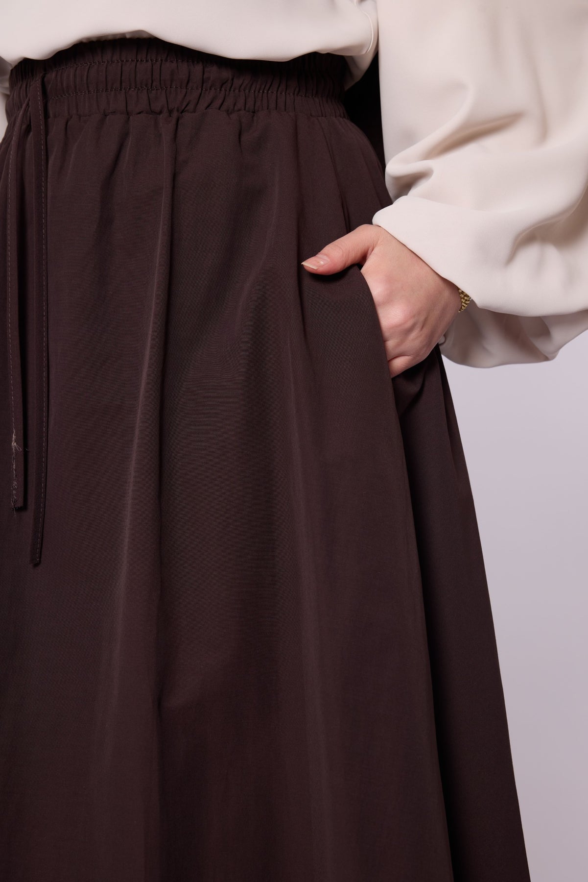 • Model: Stitch-detail flared skirt with elastic & drawstring waist