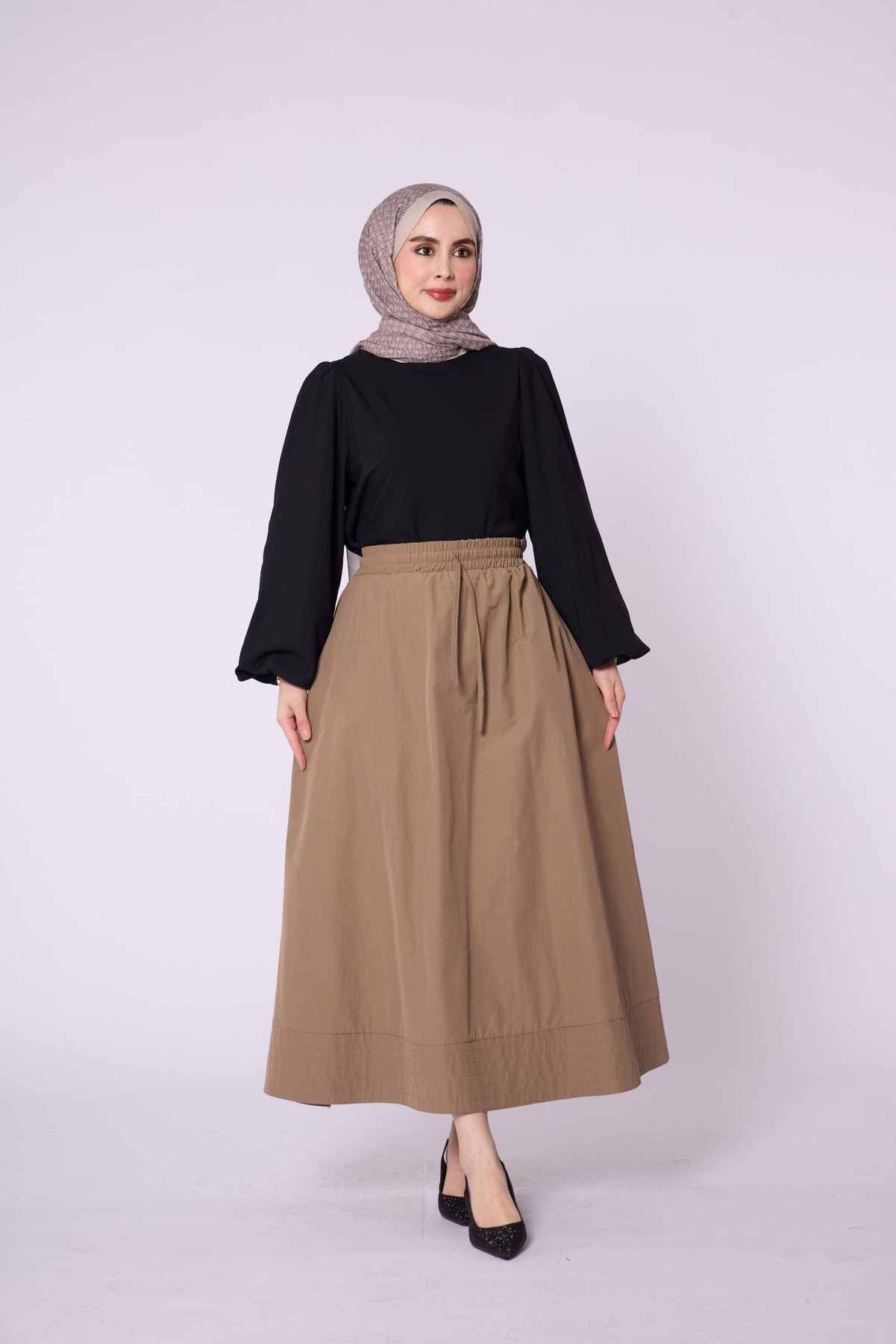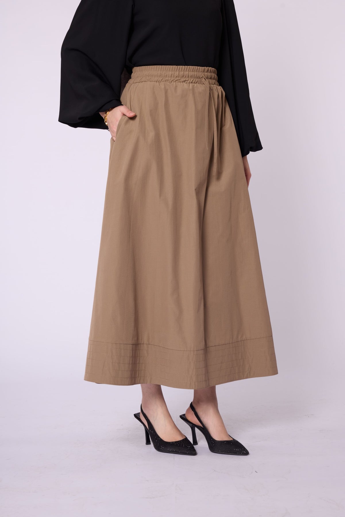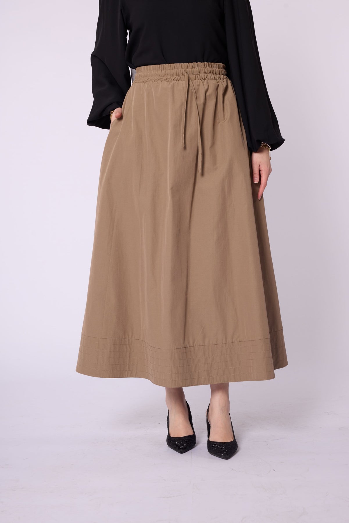 Stitch-Detail Flared Skirt with Elastic & Drawstring Waist