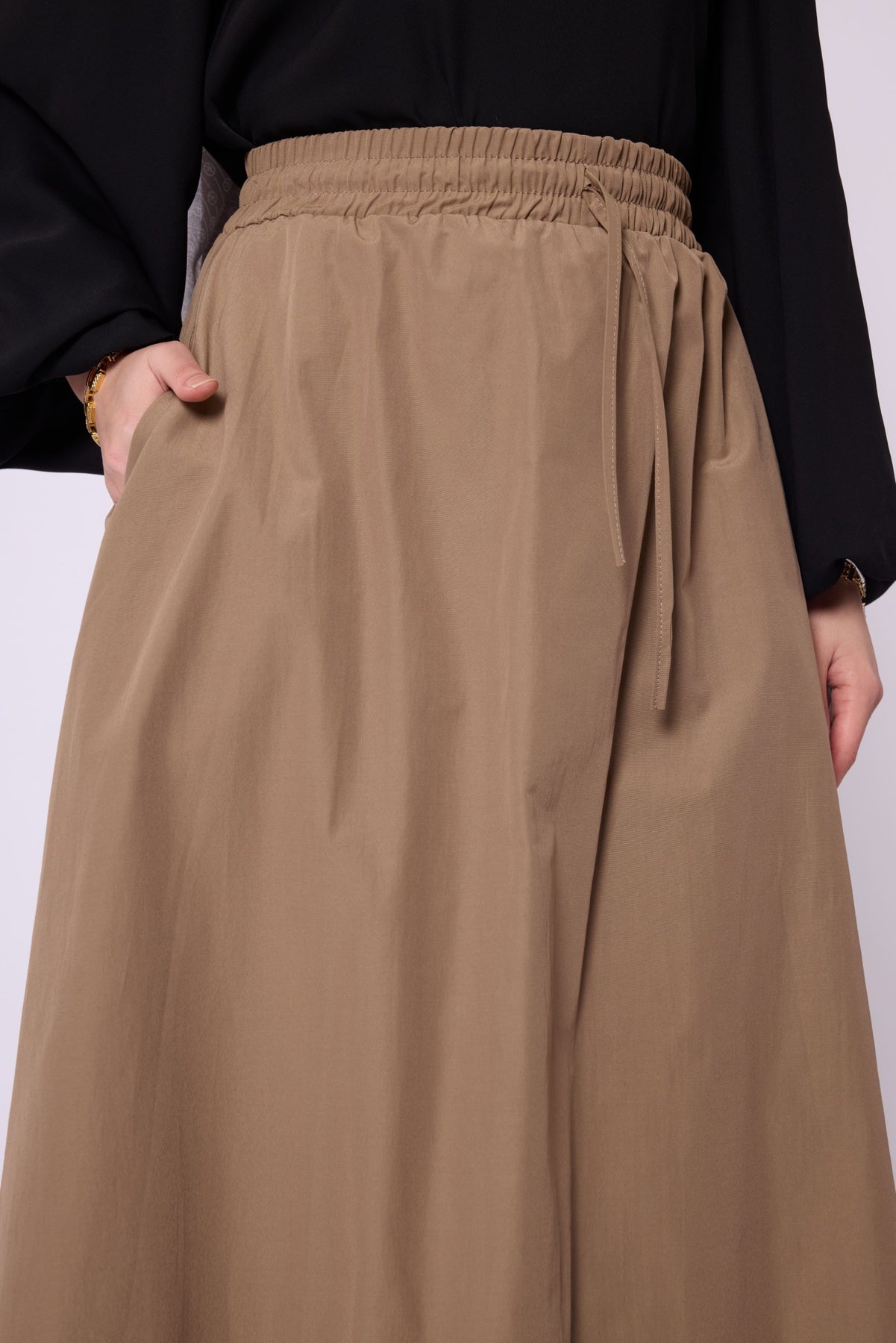 • Details: Stitch detailing, elastic waistband, drawstring/gather detail at the waist