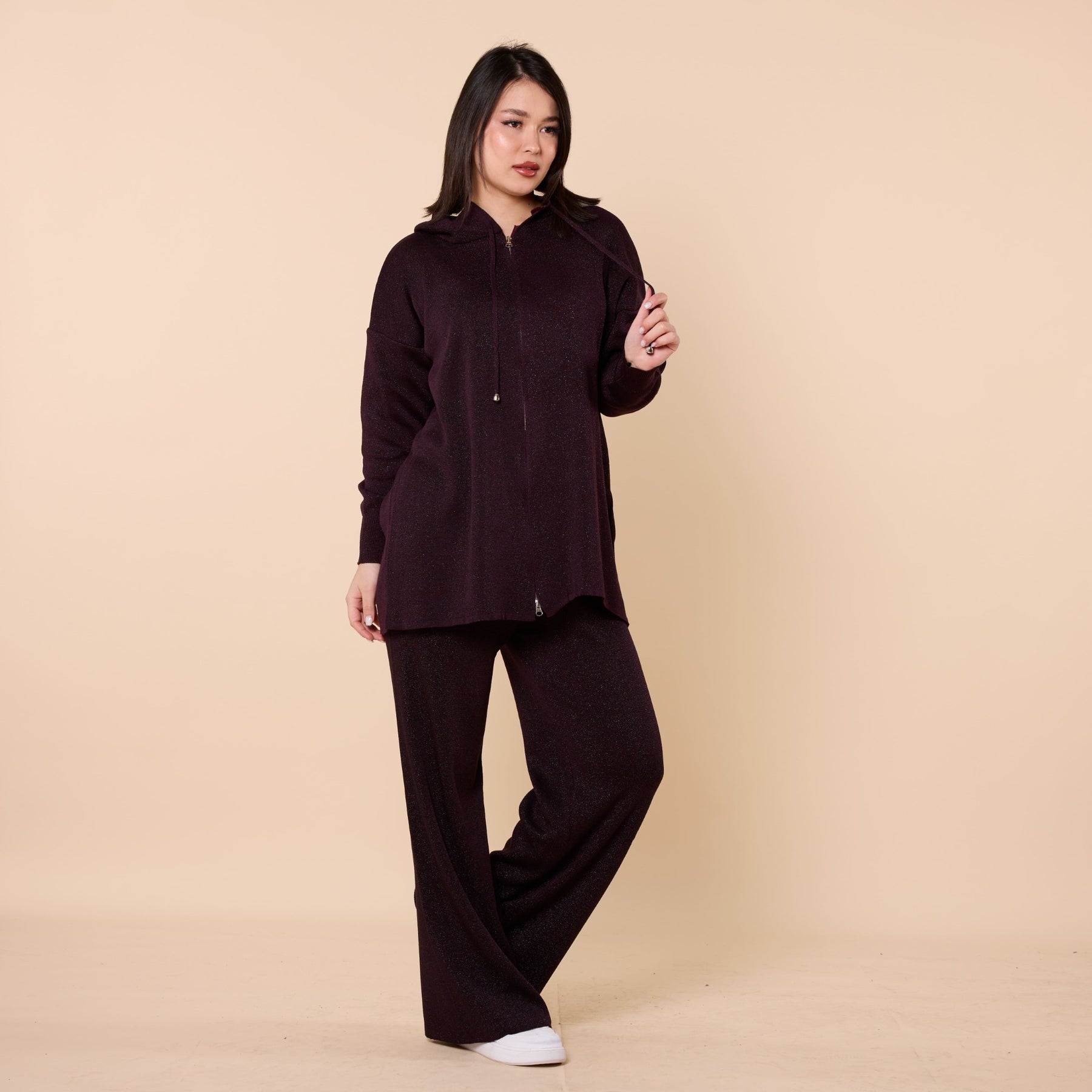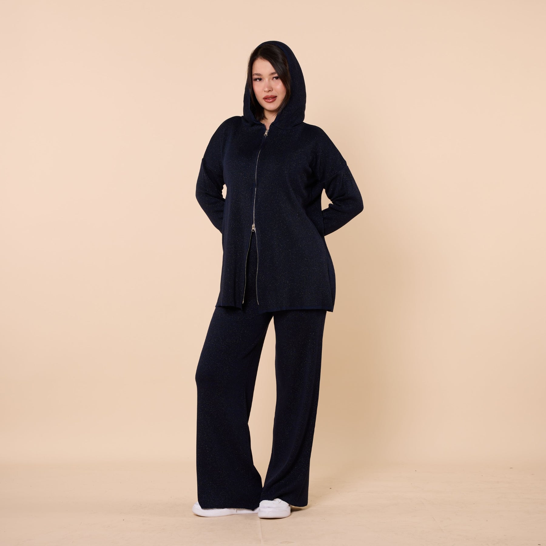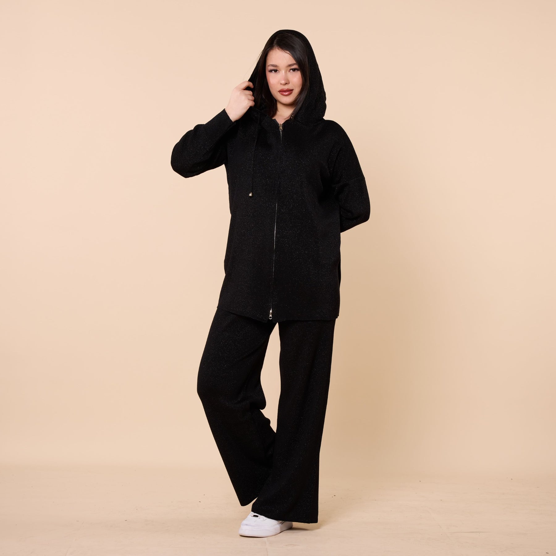 The zip-up hooded knit two-piece set stands out with its comfortable fit and modern shimmer details. Made from soft knit fabric, it provides warmth and ease throughout the day, while the subtle glitter accents add a refined touch without overpowering the look. The zippered hooded top enhances practicality and gives the set a sporty, contemporary character.