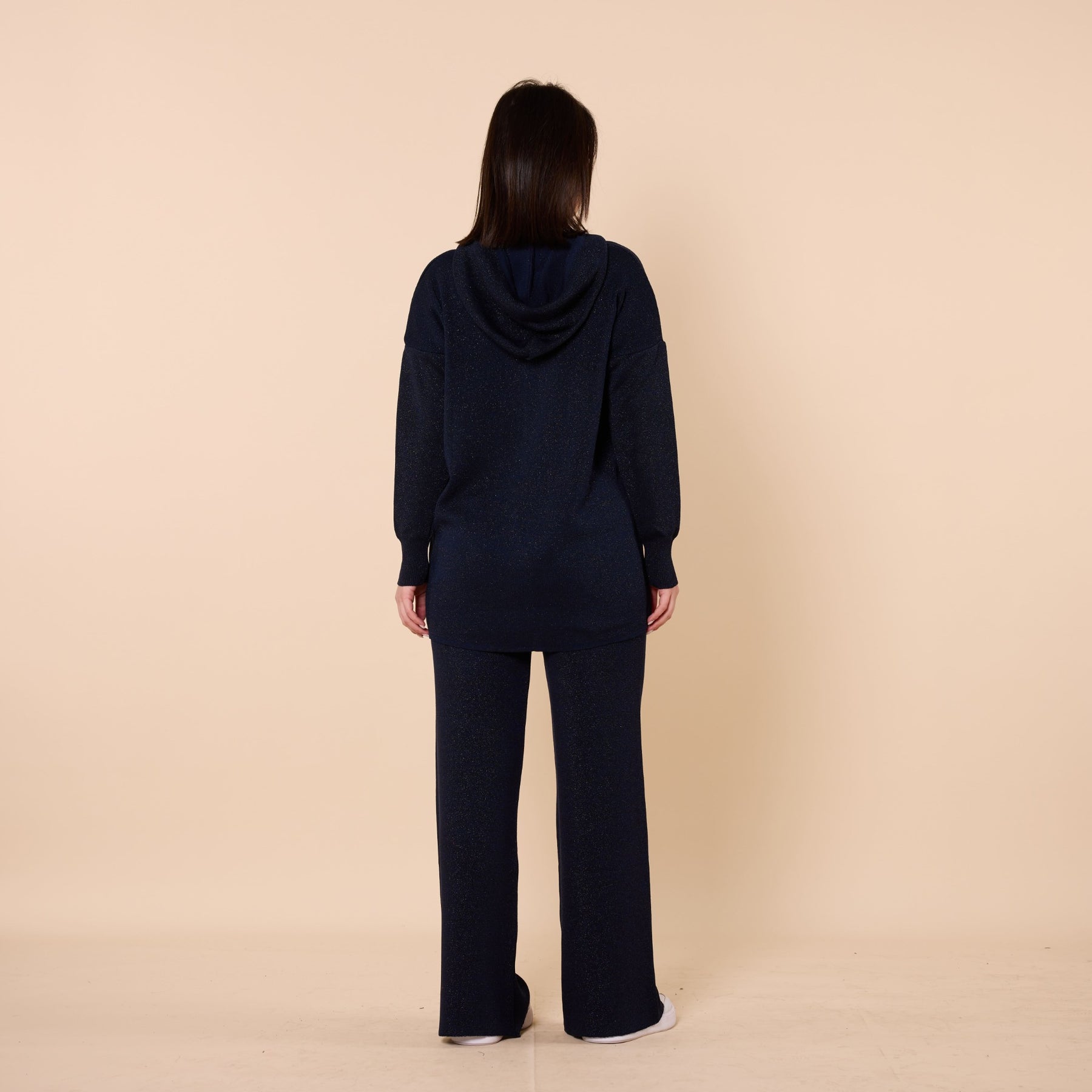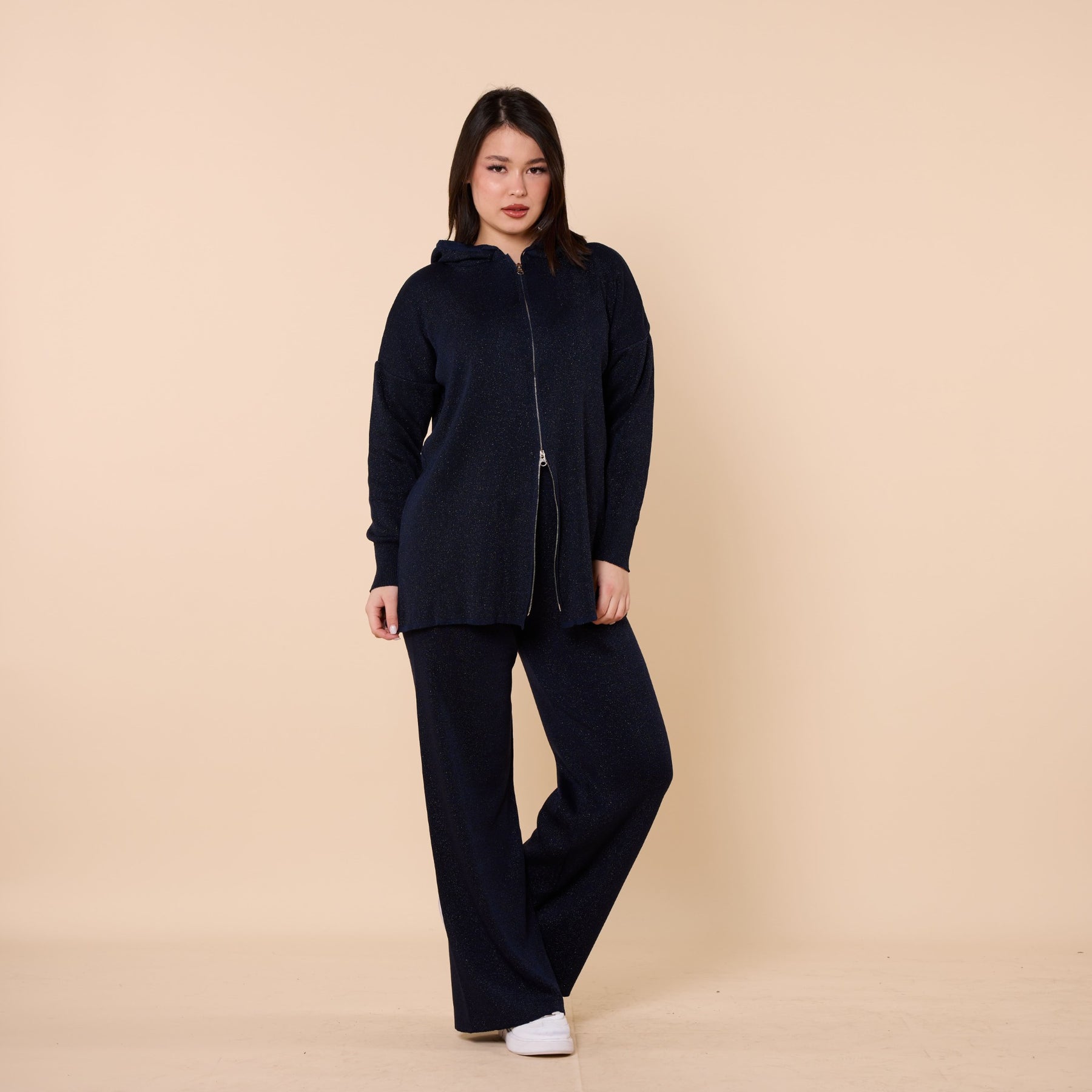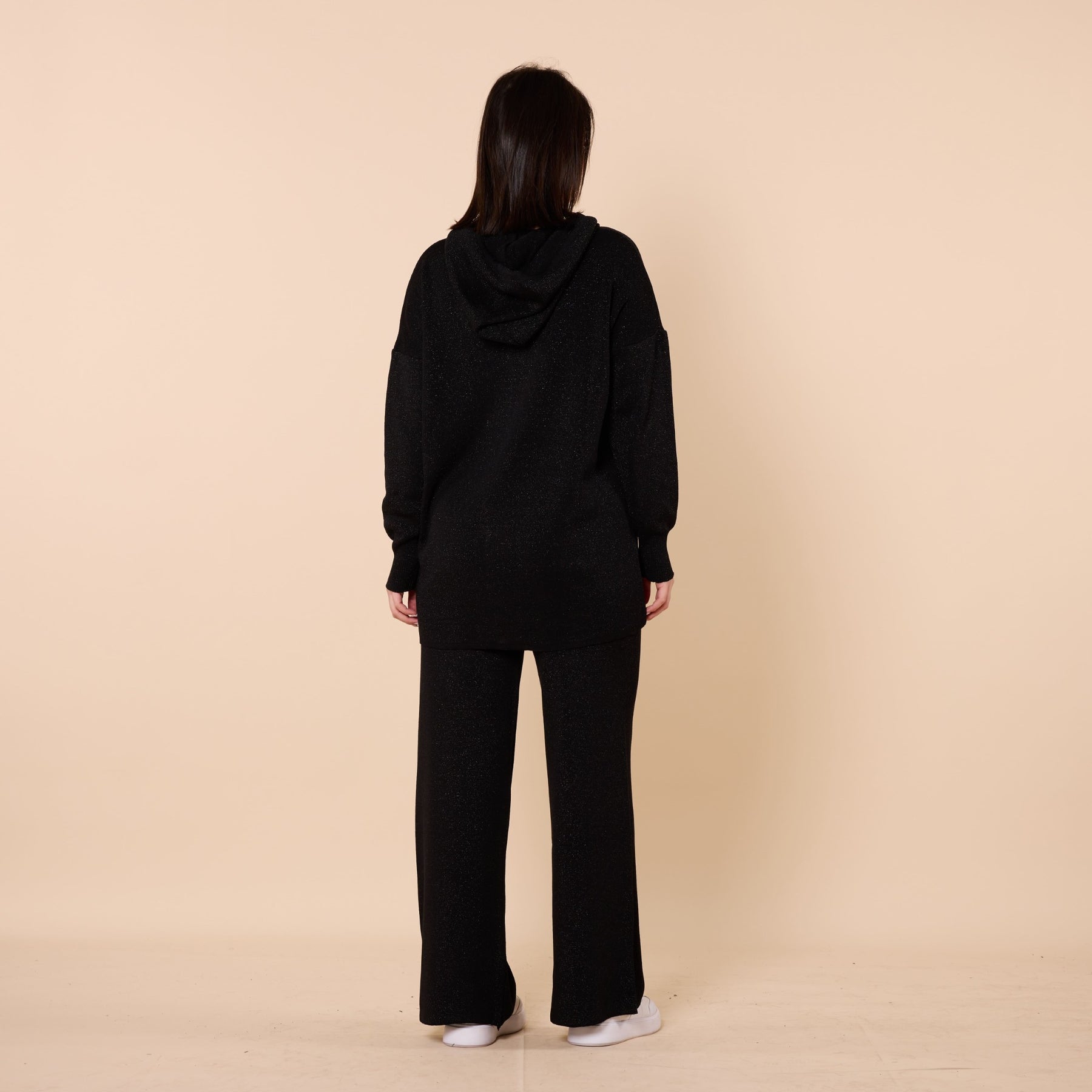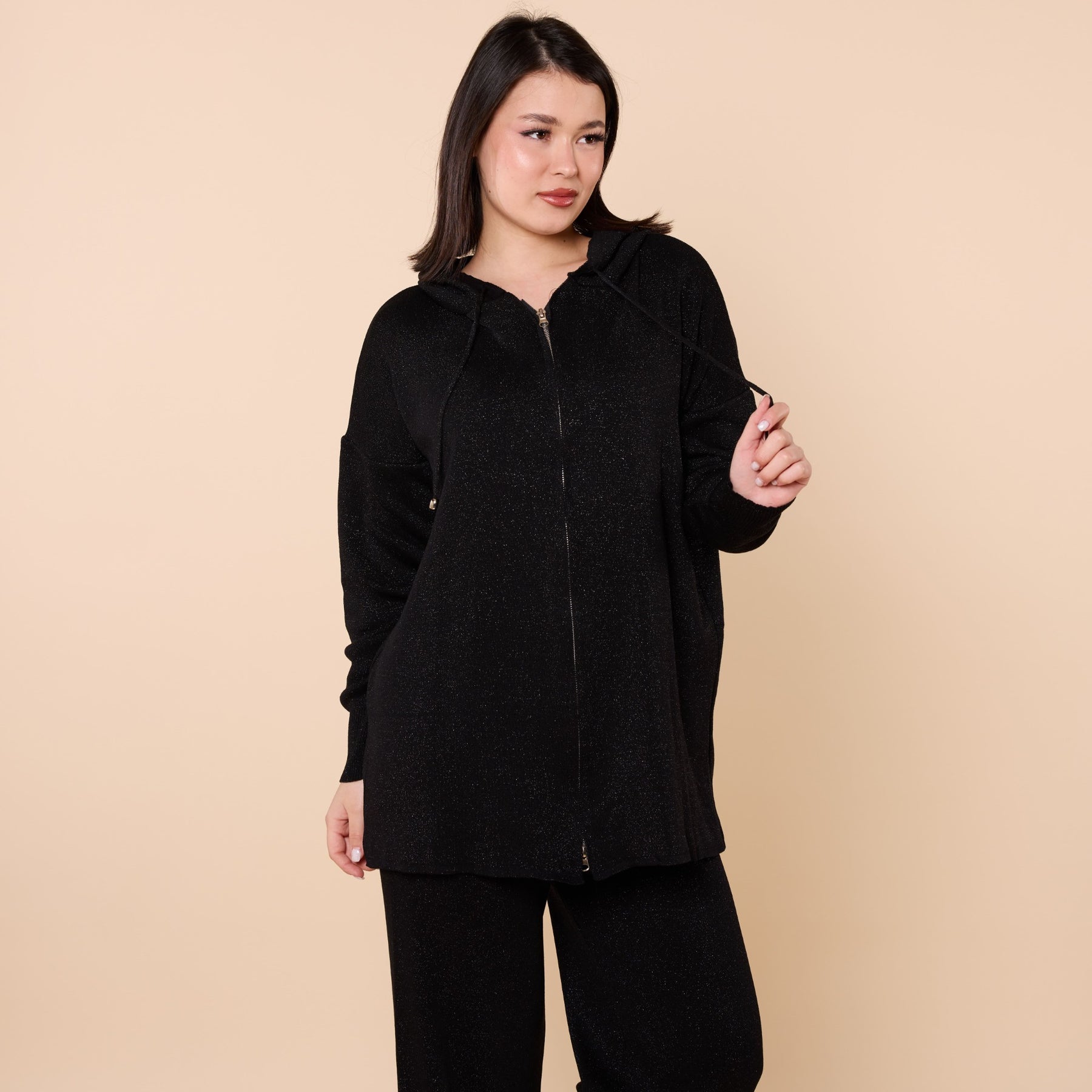 The zip-up hooded knit two-piece set stands out with its comfortable fit and modern shimmer details. Made from soft knit fabric, it provides warmth and ease throughout the day, while the subtle glitter accents add a refined touch without overpowering the look. The zippered hooded top enhances practicality and gives the set a sporty, contemporary character.