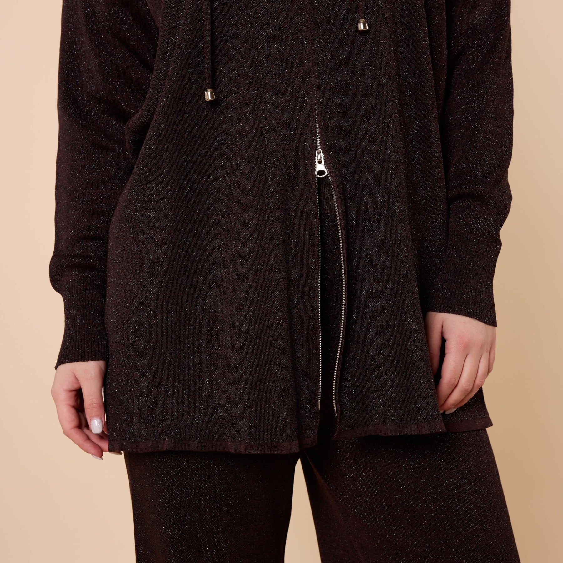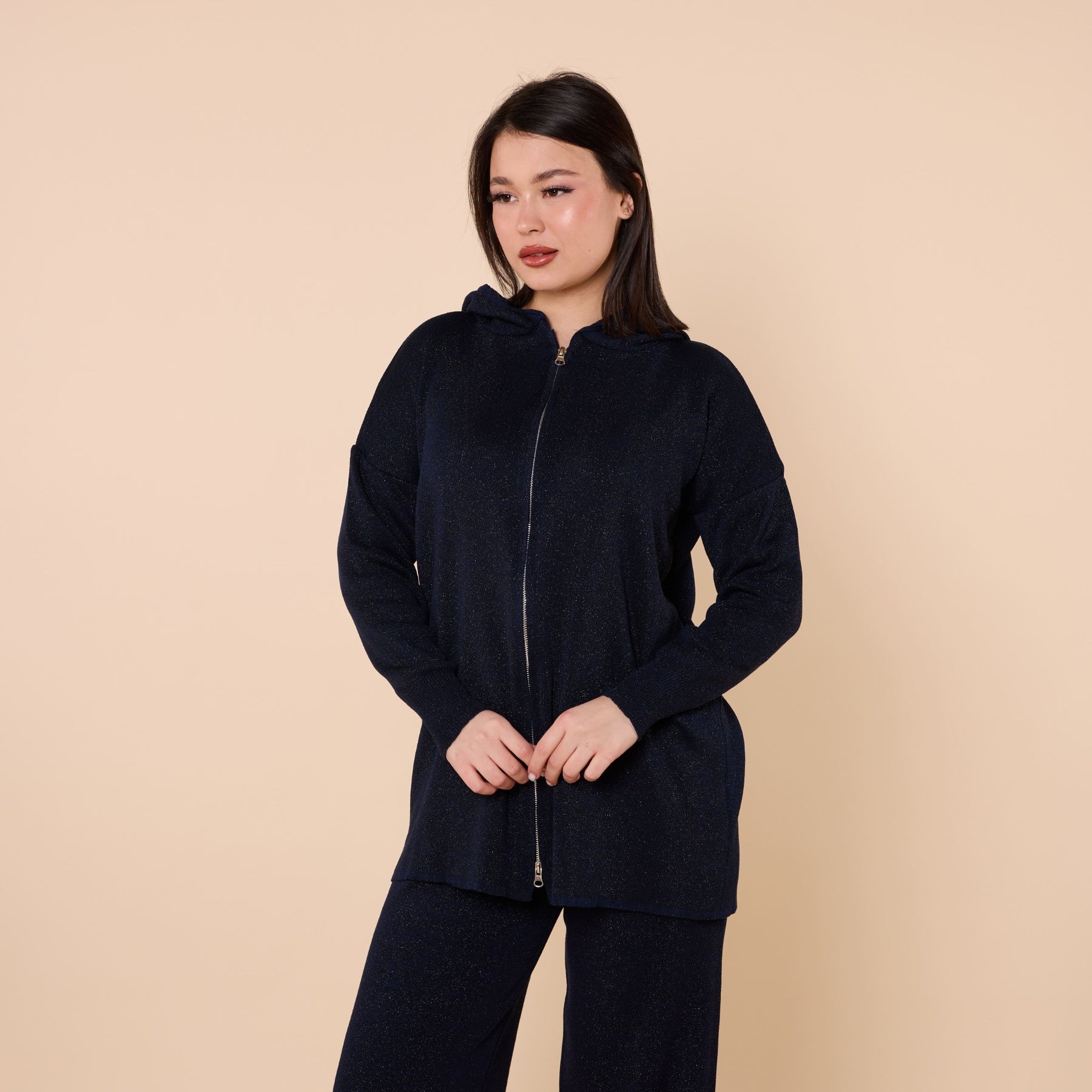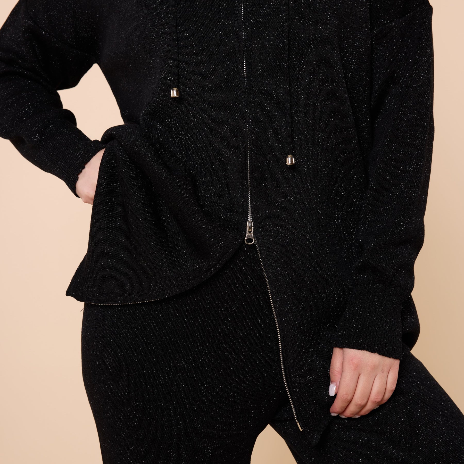• Model: Zip-up hooded knit two-piece set with shimmer details